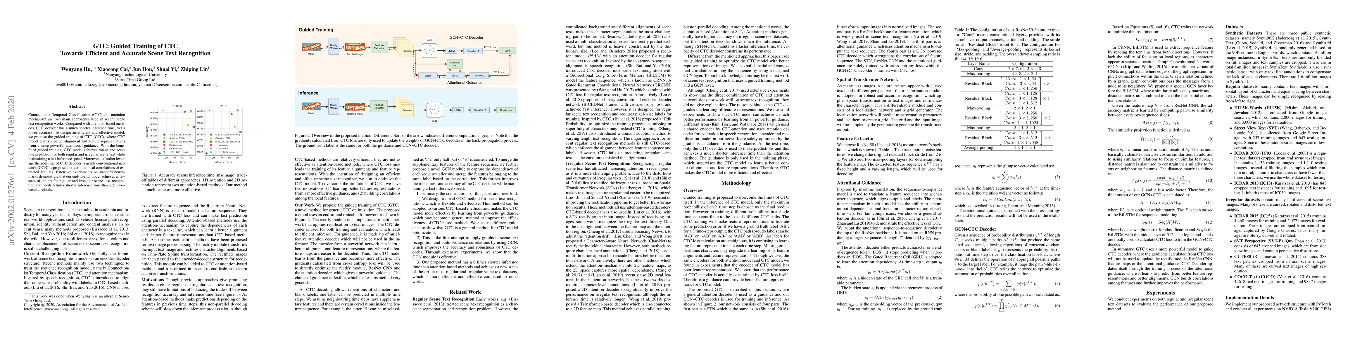 The paper proposes guided training of CTC (GTC) to enhance scene text recognition efficiency and accuracy. By leveraging attentional guidance, the GTC model achieves robust predictions while maintaining fast inference speeds, outperforming attention-based methods on standard benchmarks.