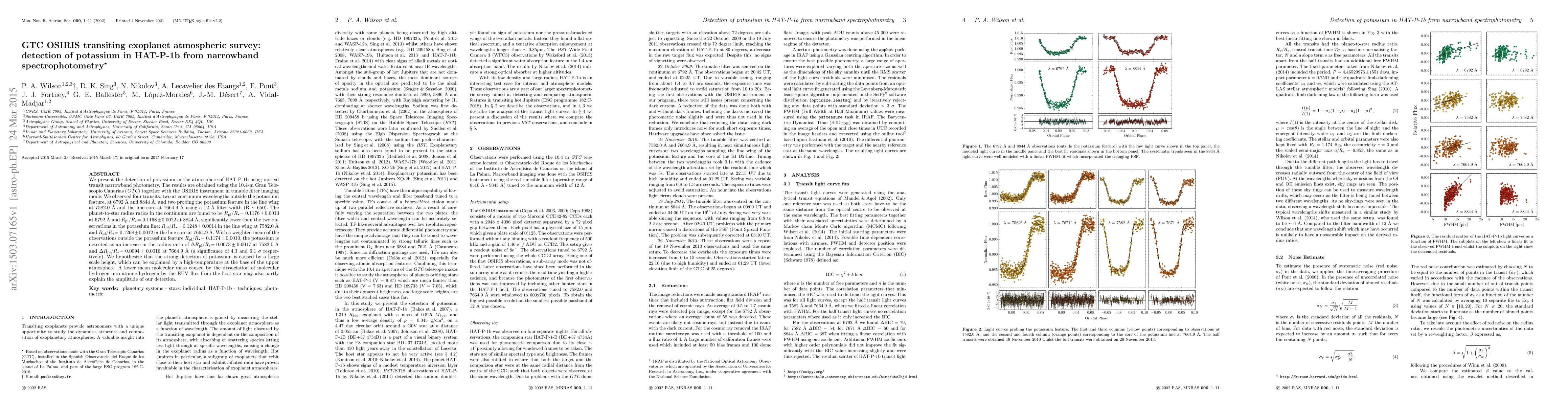This study detected potassium in the atmosphere of the exoplanet HAT-P-1b using narrowband spectrophotometry during transits with the GTC OSIRIS instrument. The potassium feature caused a significant increase in the planet-to-star radius ratio, suggesting a large atmospheric scale height due to high temperatures and possible molecular hydrogen dissociation.
