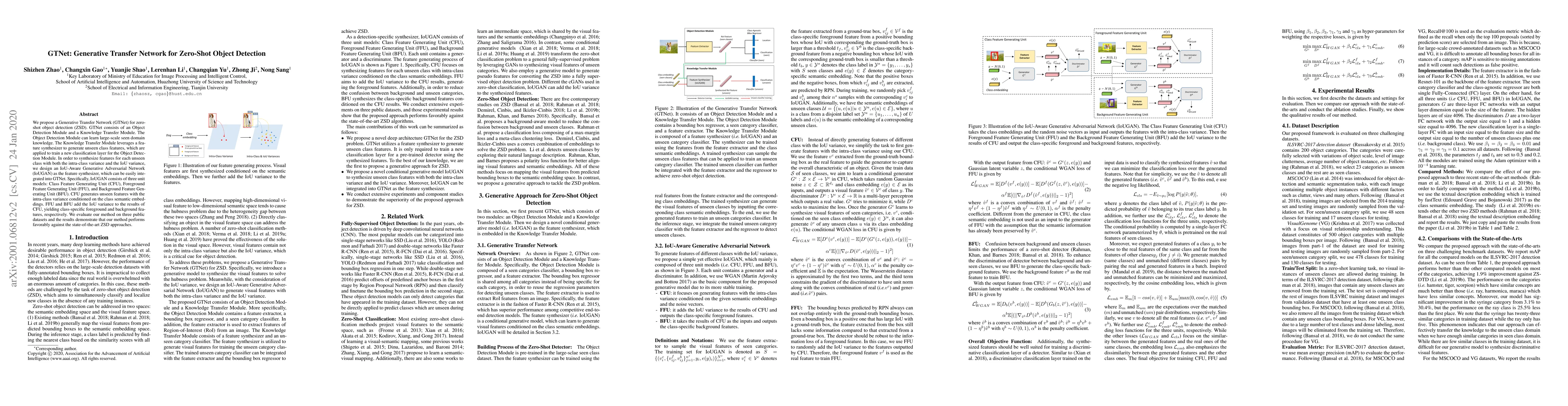 The paper proposes GTNet, a Generative Transfer Network for zero-shot object detection, combining an Object Detection Module with a Knowledge Transfer Module that uses an IoU-Aware Generative Adversarial Network to synthesize features for unseen classes, achieving competitive results on public datasets.