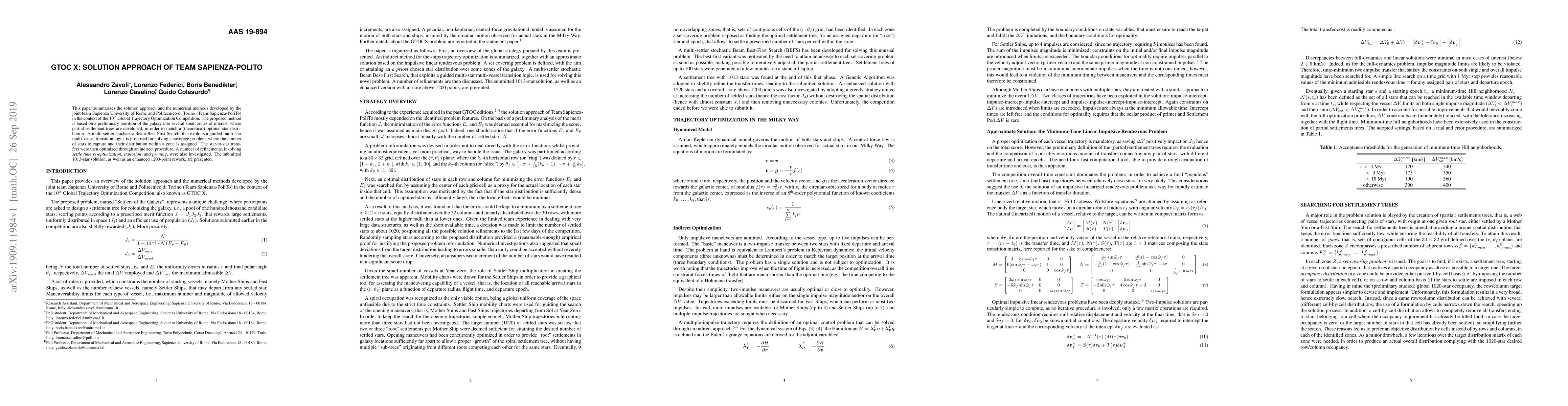 This paper summarizes the solution approach and the numerical methods developed by the joint team Sapienza University of Rome and Politecnico di Torino (Team Sapienza-PoliTo) in the context of the 10th Global Trajectory Optimization Competition. The proposed method is based on a preliminary partition of the galaxy into several small zones of interest, where partial settlement trees are developed, in order to match a (theoretical) optimal star distribution. A multi-settler stochastic Beam Best-First Search, that exploits a guided multi-star multi-vessel transition logic, is proposed for solving a coverage problem, where the number of stars to capture and their distribution within a zone is assigned. The star-to-star transfers were then optimized through an indirect procedure. A number of refinements, involving settle time re-optimization, explosion, and pruning, were also investigated. The submitted 1013-star solution, as well as an enhanced 1200-point rework, are presented.