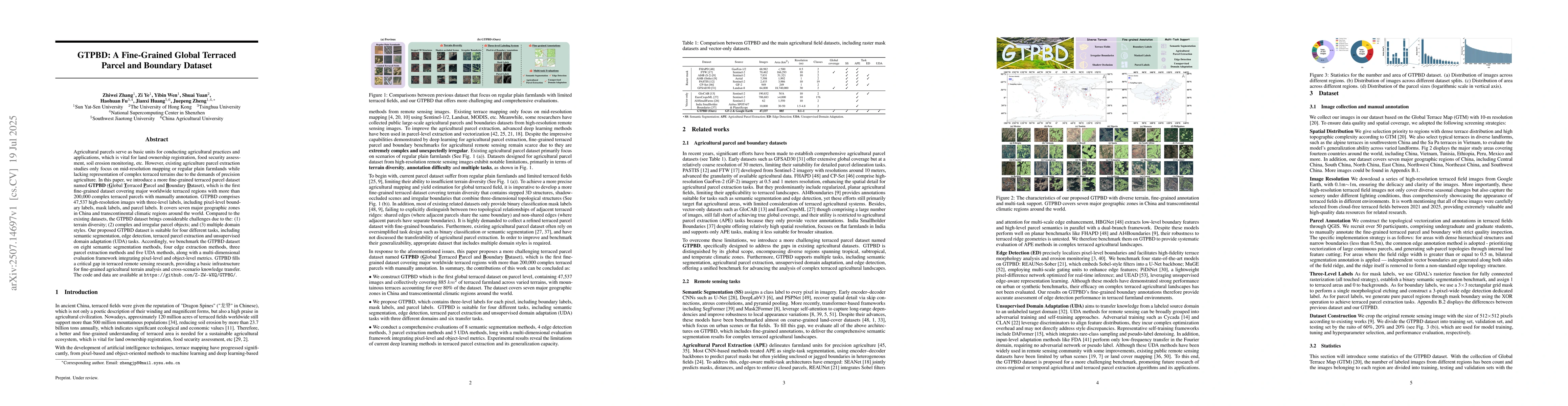 Agricultural parcels serve as basic units for conducting agricultural practices and applications, which is vital for land ownership registration, food security assessment, soil erosion monitoring, etc. However, existing agriculture parcel extraction studies only focus on mid-resolution mapping or regular plain farmlands while lacking representation of complex terraced terrains due to the demands of precision agriculture.In this paper, we introduce a more fine-grained terraced parcel dataset named GTPBD (Global Terraced Parcel and Boundary Dataset), which is the first fine-grained dataset covering major worldwide terraced regions with more than 200,000 complex terraced parcels with manual annotation. GTPBD comprises 47,537 high-resolution images with three-level labels, including pixel-level boundary labels, mask labels, and parcel labels. It covers seven major geographic zones in China and transcontinental climatic regions around the world.Compared to the existing datasets, the GTPBD dataset brings considerable challenges due to the: (1) terrain diversity; (2) complex and irregular parcel objects; and (3) multiple domain styles. Our proposed GTPBD dataset is suitable for four different tasks, including semantic segmentation, edge detection, terraced parcel extraction, and unsupervised domain adaptation (UDA) tasks.Accordingly, we benchmark the GTPBD dataset on eight semantic segmentation methods, four edge extraction methods, three parcel extraction methods, and five UDA methods, along with a multi-dimensional evaluation framework integrating pixel-level and object-level metrics. GTPBD fills a critical gap in terraced remote sensing research, providing a basic infrastructure for fine-grained agricultural terrain analysis and cross-scenario knowledge transfer.