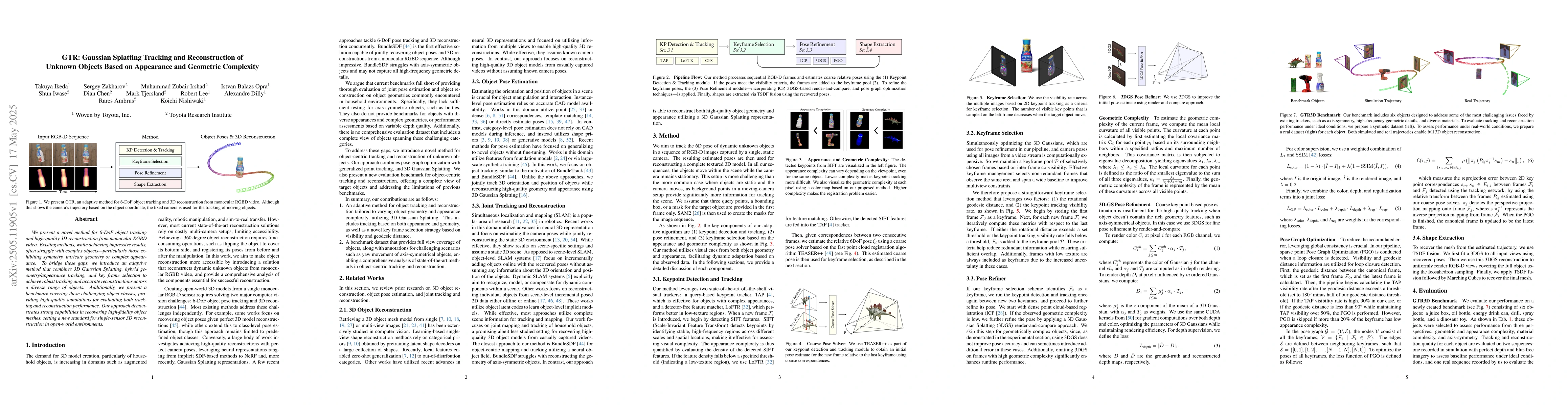 The research introduces GTR, a method combining 3D Gaussian Splatting, hybrid geometry/appearance tracking, and key frame selection for robust tracking and accurate reconstructions of complex objects in monocular RGBD video.