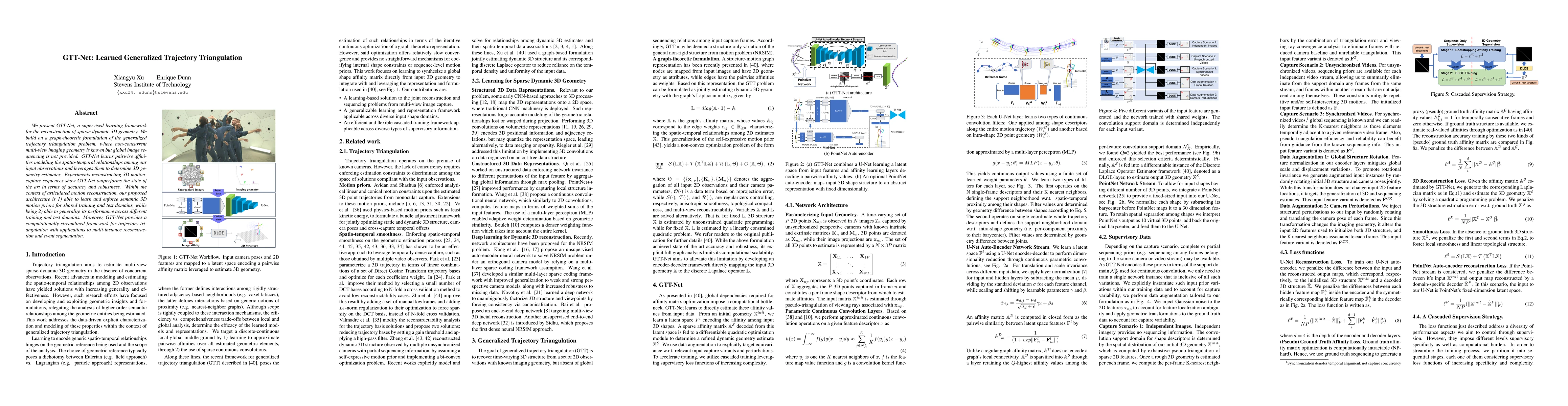 GTT-Net is a supervised learning framework for reconstructing sparse dynamic 3D geometry through generalized trajectory triangulation. It outperforms existing methods in accuracy and robustness for articulated motion reconstruction, while generalizing across different domains.