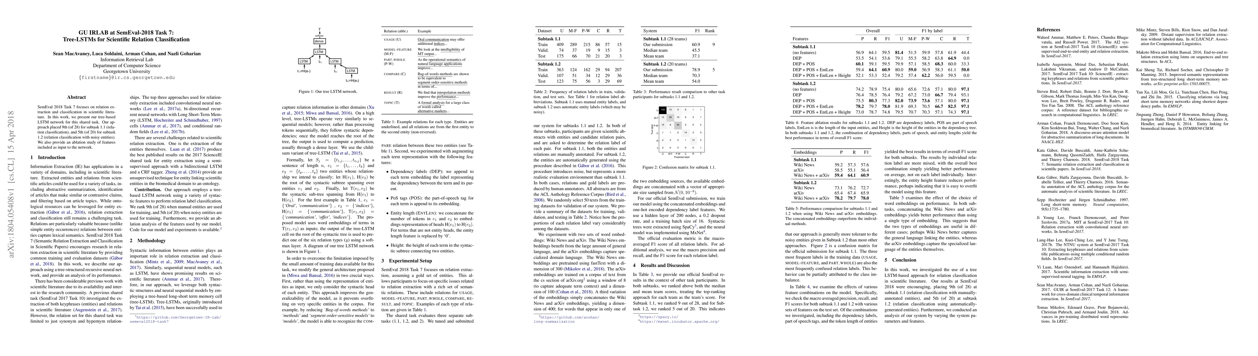 SemEval 2018 Task 7 focuses on relation ex- traction and classification in scientific literature. In this work, we present our tree-based LSTM network for this shared task. Our approach placed 9th (of 28) for subtask 1.1 (relation classification), and 5th (of 20) for subtask 1.2 (relation classification with noisy entities). We also provide an ablation study of features included as input to the network.