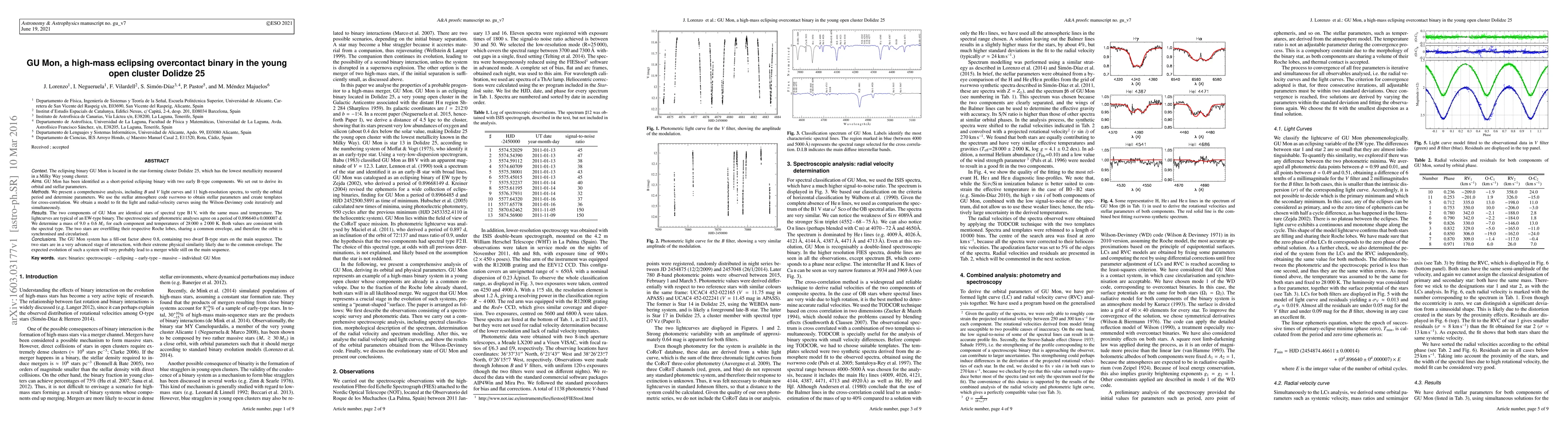 GU Mon is a high-mass eclipsing overcontact binary in the low-metallicity cluster Dolidze 25, consisting of two identical B1 V stars sharing a common envelope. Analysis reveals a synchronized, circularized orbit with a period of 0.896640 days, each star having a mass of 9.0 Msun and a temperature of 28,000 K, suggesting a probable merger on the main sequence.