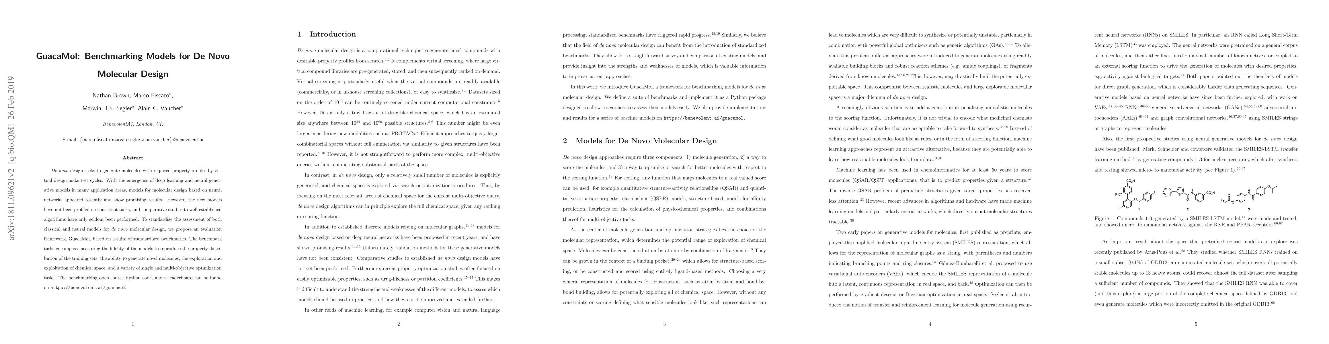 GuacaMol is an evaluation framework designed to benchmark both classical and neural models for de novo molecular design, offering standardized tasks to assess model fidelity, novelty generation, and optimization capabilities. The framework aims to facilitate comparative studies and consistent assessment of emerging neural generative models.