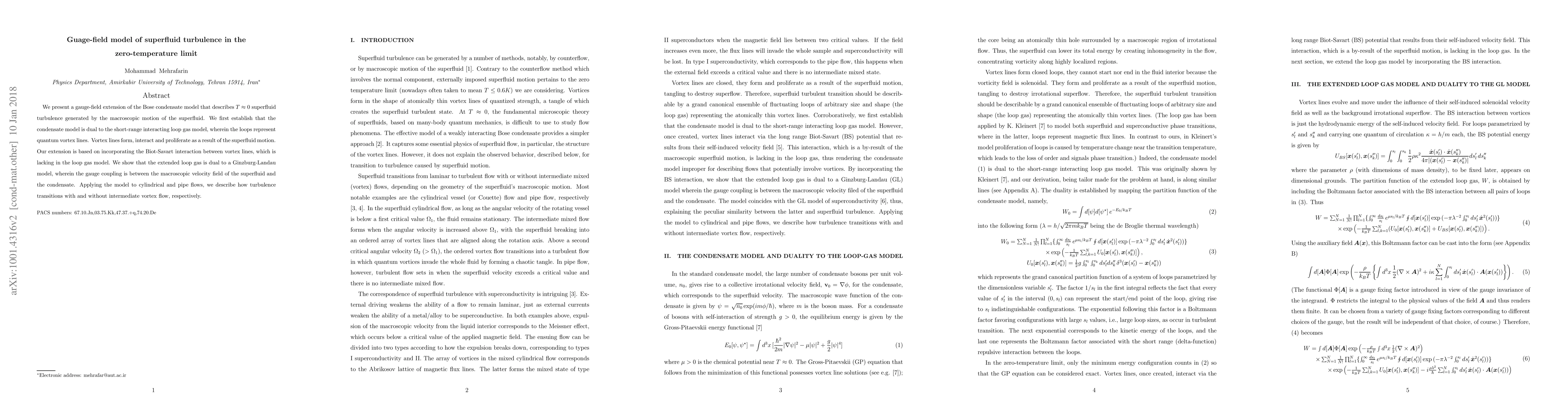 We present a gauge-field extension of the Bose condensate model that describes $T\approx0$ superfluid turbulence generated by the macroscopic motion of the superfluid. We first establish that the condensate model is dual to the short-range interacting loop gas model, wherein the loops represent quantum vortex lines. Vortex lines form, interact and proliferate as a result of the superfluid motion. Our extension is based on incorporating the Biot-Savart interaction between vortex lines, which is lacking in the loop gas model. We show that the extended loop gas is dual to a Ginzburg-Landau model, wherein the gauge coupling is between the macroscopic velocity field of the superfluid and the condensate. Applying the model to cylindrical and pipe flows, we describe how turbulence transitions with and without intermediate vortex flow, respectively.