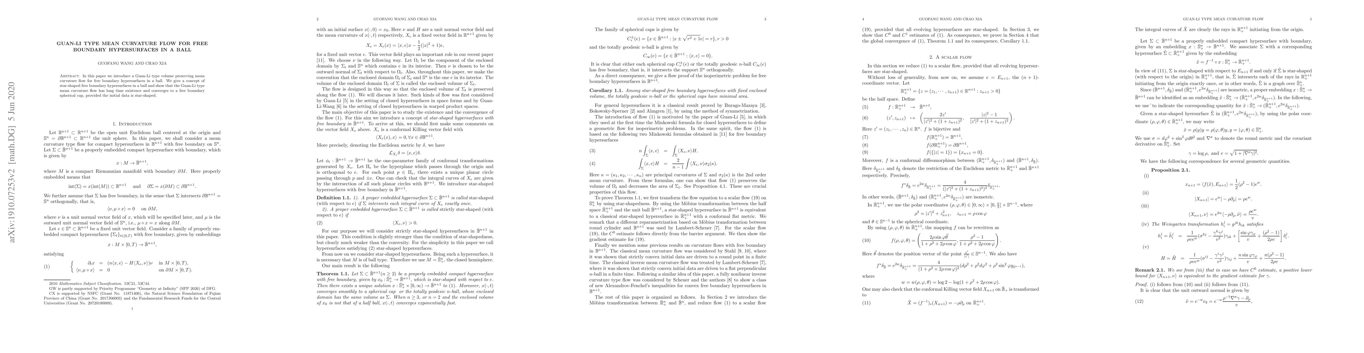 In this paper we introduce a Guan-Li type volume preserving mean curvature flow for free boundary hypersurfaces in a ball. We give a concept of star-shaped free boundary hypersurfaces in a ball and show that the Guan-Li type mean curvature flow has long time existence and converges to a free boundary spherical cap, provided the initial data is star-shaped.