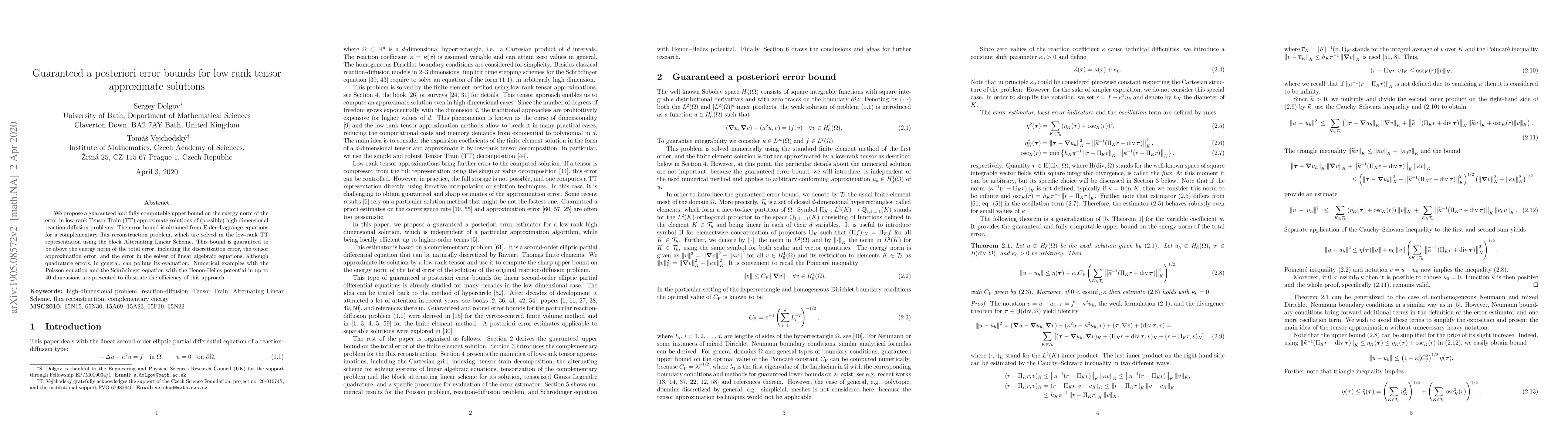 We propose a guaranteed and fully computable upper bound on the energy norm of the error in low-rank Tensor Train (TT) approximate solutions of (possibly) high dimensional reaction-diffusion problems. The error bound is obtained from Euler-Lagrange equations for a complementary flux reconstruction problem, which are solved in the low-rank TT representation using the block Alternating Linear Scheme. This bound is guaranteed to be above the energy norm of the total error, including the discretization error, the tensor approximation error, and the error in the solver of linear algebraic equations, although quadrature errors, in general, can pollute its evaluation. Numerical examples with the Poisson equation and the Schroedinger equation with the Henon-Heiles potential in up to 40 dimensions are presented to illustrate the efficiency of this approach.