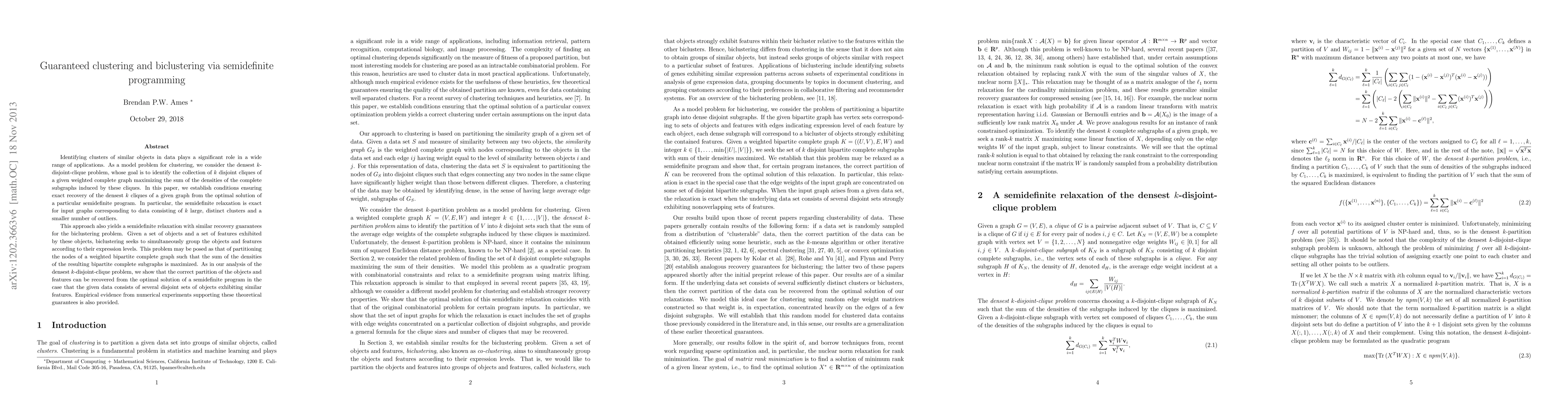 Identifying clusters of similar objects in data plays a significant role in a wide range of applications. As a model problem for clustering, we consider the densest k-disjoint-clique problem, whose goal is to identify the collection of k disjoint cliques of a given weighted complete graph maximizing the sum of the densities of the complete subgraphs induced by these cliques. In this paper, we establish conditions ensuring exact recovery of the densest k cliques of a given graph from the optimal solution of a particular semidefinite program. In particular, the semidefinite relaxation is exact for input graphs corresponding to data consisting of k large, distinct clusters and a smaller number of outliers. This approach also yields a semidefinite relaxation for the biclustering problem with similar recovery guarantees. Given a set of objects and a set of features exhibited by these objects, biclustering seeks to simultaneously group the objects and features according to their expression levels. This problem may be posed as partitioning the nodes of a weighted bipartite complete graph such that the sum of the densities of the resulting bipartite complete subgraphs is maximized. As in our analysis of the densest k-disjoint-clique problem, we show that the correct partition of the objects and features can be recovered from the optimal solution of a semidefinite program in the case that the given data consists of several disjoint sets of objects exhibiting similar features. Empirical evidence from numerical experiments supporting these theoretical guarantees is also provided.