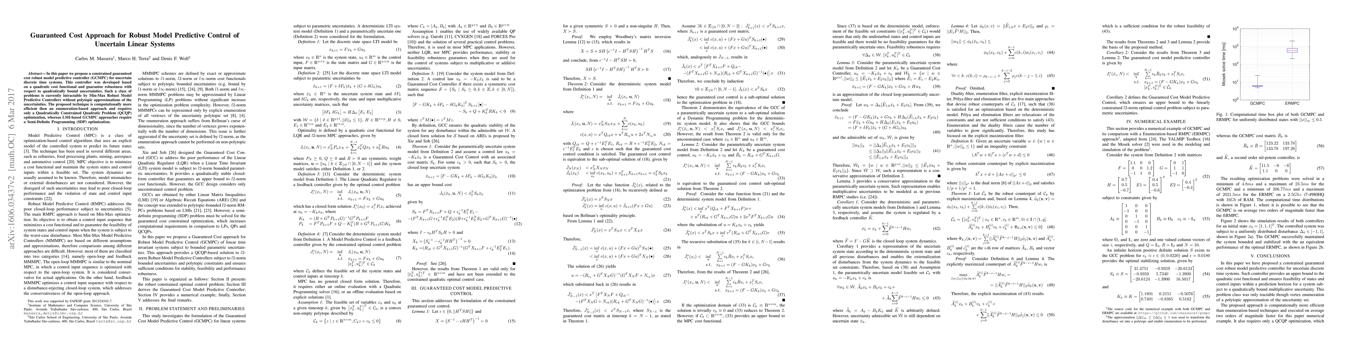 In this paper we propose a constrained guaranteed cost robust model predictive controller (GCMPC) for uncertain discrete time systems. This controller was developed based on a quadratic cost functional and guarantee robustness with respect to quadratically bound uncertainties. Such a class of problems is currently intractable by Min-Max Robust Model Predictive Controllers without polytopic approximations of the uncertainties. The proposed technique is computationally more efficient then an enumeration-based approach and requires only a Quadratically Constrained Quadratic Problem (QCQP) optimization, whereas LMI-based GCMPC approaches require a Semi-Definite Programming (SDP) optimization.