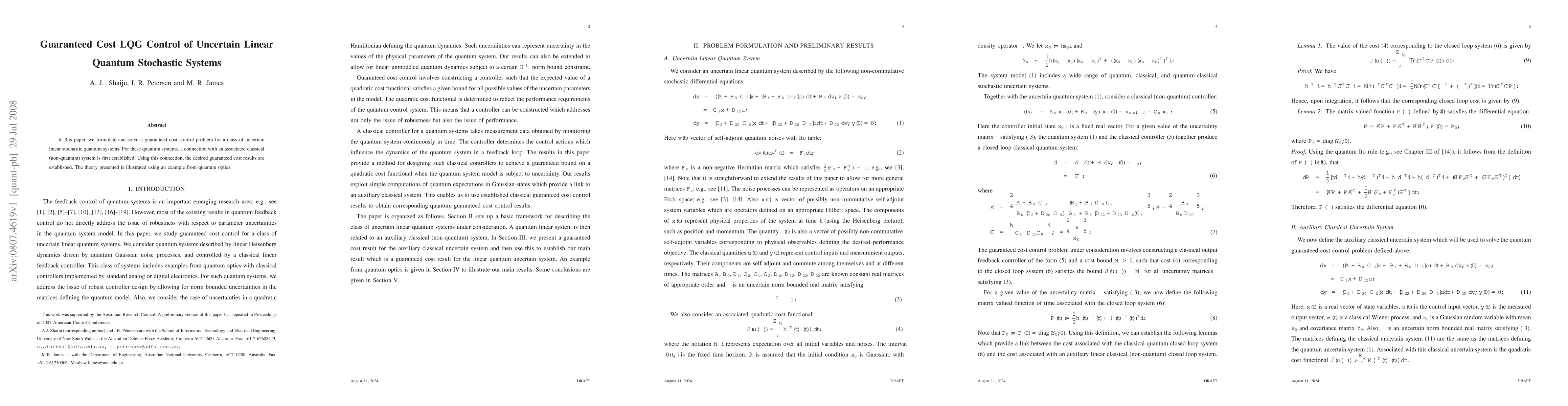 In this paper, we formulate and solve a guaranteed cost control problem for a class of uncertain linear stochastic quantum systems. For these quantum systems, a connection with an associated classical (non-quantum) system is first established. Using this connection, the desired guaranteed cost results are established. The theory presented is illustrated using an example from quantum optics.