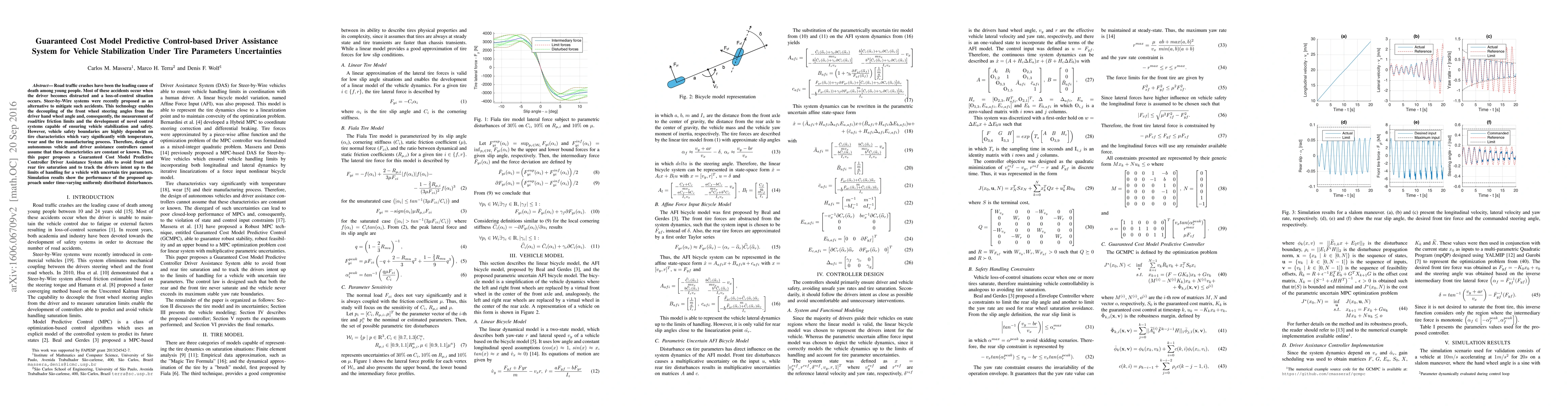 Road traffic crashes have been the leading cause of death among young people. Most of these accidents occur when the driver becomes distracted and a loss-of-control situation occurs. Steer-by-Wire systems were recently proposed as an alternative to mitigate such accidents. This technology enables the decoupling of the front wheel steering angles from the driver hand wheel angle and, consequently, the measurement of road/tire friction limits and the development of novel control systems capable of ensuring vehicle stabilization and safety. However, vehicle safety boundaries are highly dependent on tire characteristics which vary significantly with temperature, wear and the tire manufacturing process. Therefore, design of autonomous vehicle and driver assistance controllers cannot assume that these characteristics are constant or known. Thus, this paper proposes a Guaranteed Cost Model Predictive Controller Driver Assistance System able to avoid front and rear tire saturation and to track the drivers intent up to the limits of handling for a vehicle with uncertain tire parameters. Simulation results show the performance of the proposed approach under time-varying uniformly distributed disturbances.
