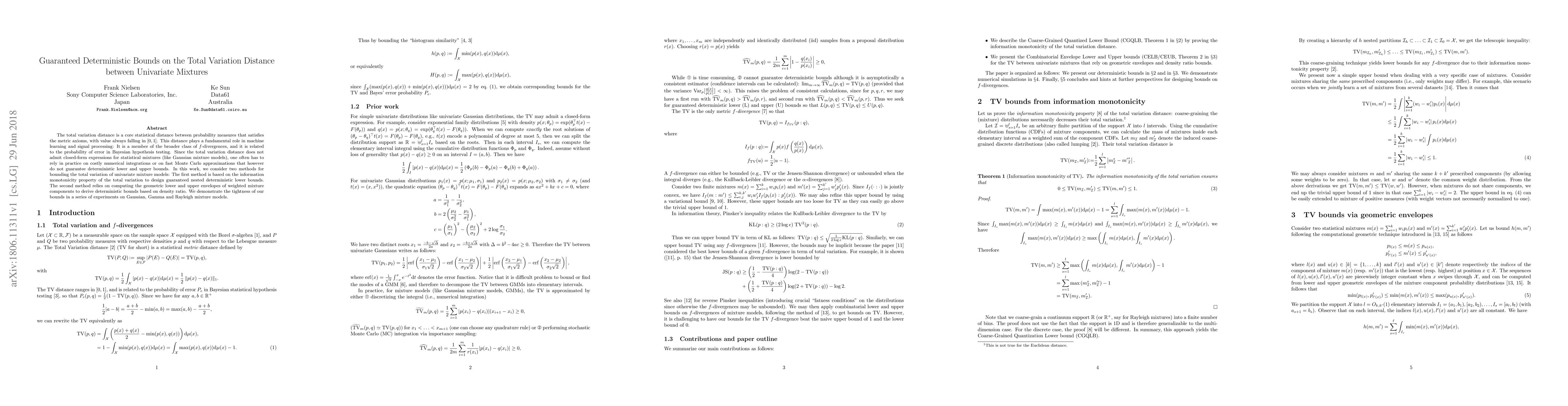 This paper presents two methods for obtaining guaranteed deterministic bounds on the total variation distance between univariate mixture models, addressing the lack of closed-form expressions and reliance on costly numerical approximations. The methods leverage information monotonicity and geometric envelopes to provide tight bounds, demonstrated through experiments on Gaussian, Gamma, and Rayleigh mixtures.