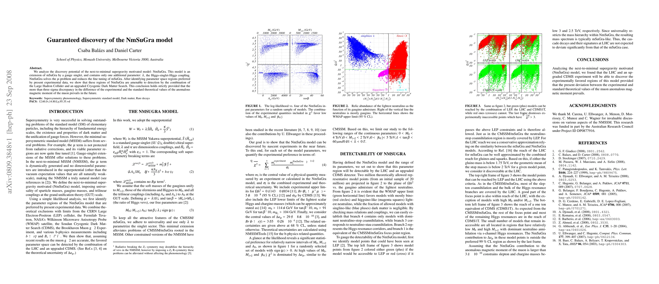 We analyze the discovery potential of the next-to-minimal supergravity motivated model: NmSuGra. This model is an extension of mSuGra by a gauge singlet, and contains only one additional parameter: lambda, the Higgs-singlet-Higgs coupling. NmSuGra solves the mu-problem and reduces the fine tuning of mSuGra. After identifying parameter space regions preferred by present experimental data, we show that these regions of NmSuGra are amenable to detection by the combination of the Large Hadron Collider and an upgraded Cryogenic Dark Matter Search. This conclusion holds strictly provided that the more than three sigma discrepancy in the difference of the experimental and the standard theoretical values of the anomalous magnetic moment of the muon prevails in the future.