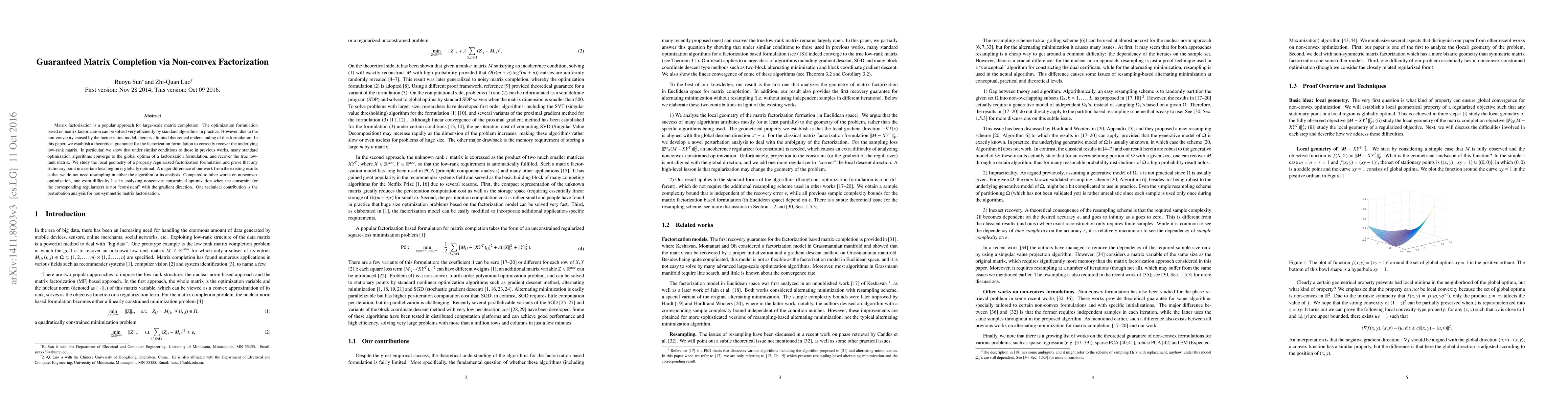 This paper establishes theoretical guarantees for non-convex matrix factorization in matrix completion, proving that standard algorithms converge to global optima and recover the true low-rank matrix without requiring resampling. It also introduces a novel perturbation analysis for non-symmetric matrix factorization to address the challenge of non-consistent constraints.