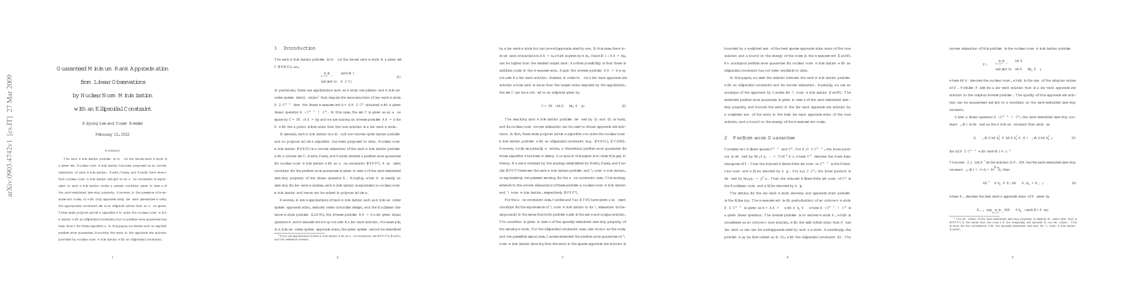 This paper proposes a convex relaxation for the rank minimization problem using nuclear norm minimization with an ellipsoidal constraint to handle measurement noise. It provides a performance guarantee bounding the error in the approximate solution, ensuring reliable results in the presence of noise.