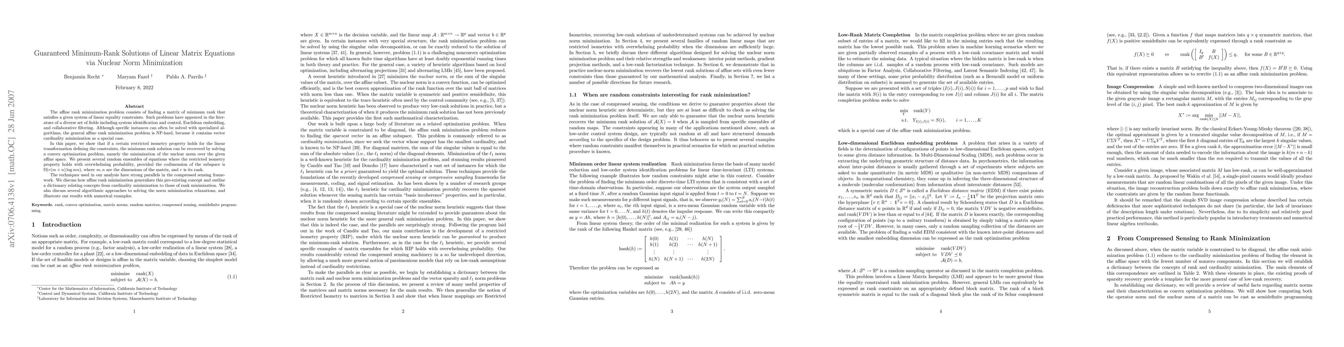 This paper addresses the NP-hard affine rank minimization problem by demonstrating that under a certain restricted isometry property, the minimum rank solution can be found via nuclear norm minimization. It presents random ensembles where this property holds with high probability, drawing parallels to compressed sensing techniques.