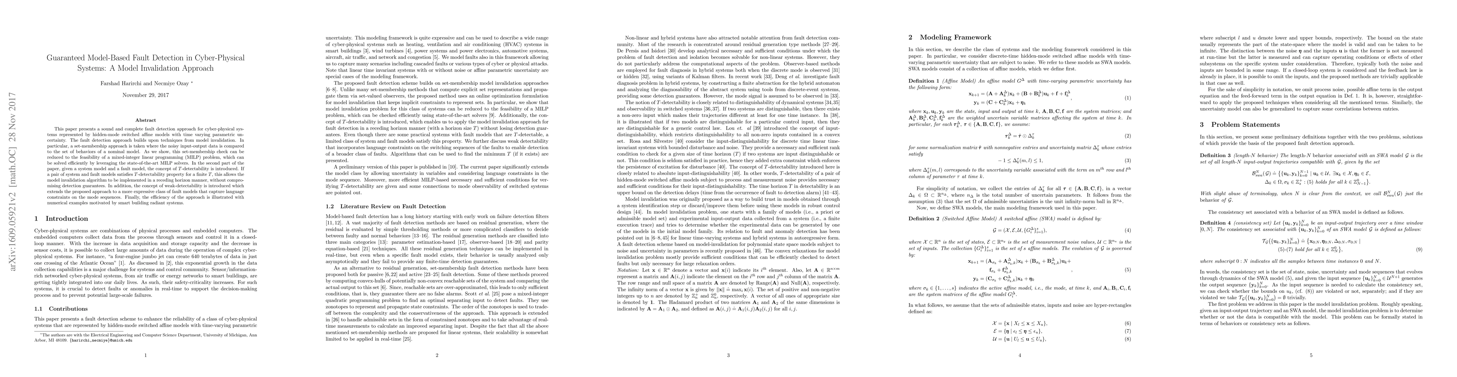 This paper proposes a model invalidation approach for fault detection in cyber-physical systems, reducing the problem to a feasible mixed-integer linear programming problem. The method introduces T-detectability and weak-detectability to ensure reliable detection over finite time horizons and extend applicability to more complex fault models.
