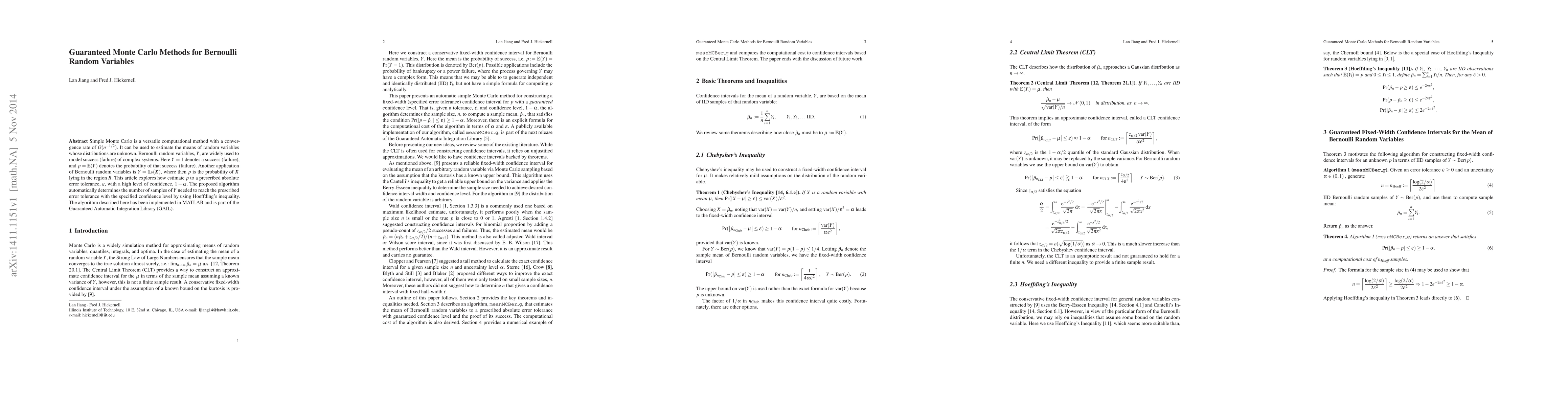 Simple Monte Carlo is a versatile computational method with a convergence rate of $O(n^{-1/2})$. It can be used to estimate the means of random variables whose distributions are unknown. Bernoulli random variables, $Y$, are widely used to model success (failure) of complex systems. Here $Y=1$ denotes a success (failure), and $p=\mathbb{E}(Y)$ denotes the probability of that success (failure). Another application of Bernoulli random variables is $Y=\mathbb{1}_{R}(\boldsymbol{X})$, where then $p$ is the probability of $\boldsymbol{X}$ lying in the region $R$. This article explores how estimate $p$ to a prescribed absolute error tolerance, $\varepsilon$, with a high level of confidence, $1-\alpha$. The proposed algorithm automatically determines the number of samples of $Y$ needed to reach the prescribed error tolerance with the specified confidence level by using Hoeffding's inequality. The algorithm described here has been implemented in MATLAB and is part of the Guaranteed Automatic Integration Library (GAIL).