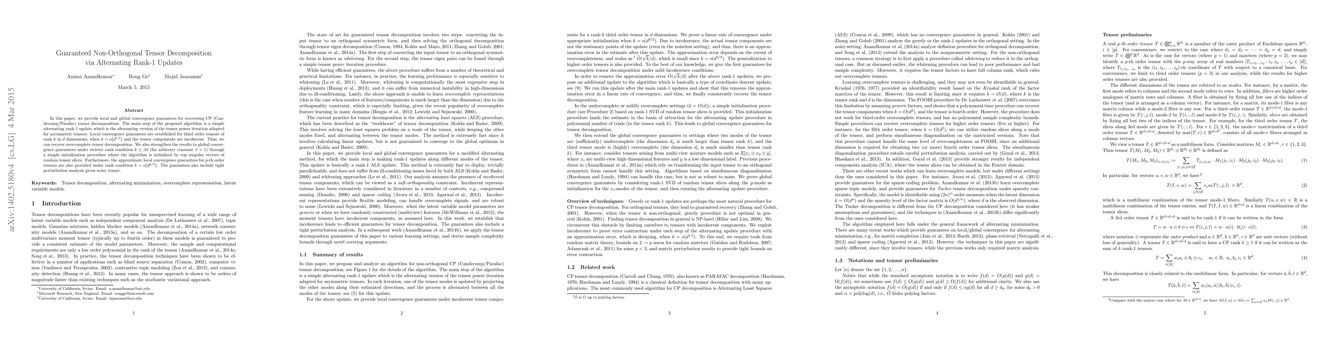 In this paper, we provide local and global convergence guarantees for recovering CP (Candecomp/Parafac) tensor decomposition. The main step of the proposed algorithm is a simple alternating rank-$1$ update which is the alternating version of the tensor power iteration adapted for asymmetric tensors. Local convergence guarantees are established for third order tensors of rank $k$ in $d$ dimensions, when $k=o \bigl( d^{1.5} \bigr)$ and the tensor components are incoherent. Thus, we can recover overcomplete tensor decomposition. We also strengthen the results to global convergence guarantees under stricter rank condition $k \le \beta d$ (for arbitrary constant $\beta > 1$) through a simple initialization procedure where the algorithm is initialized by top singular vectors of random tensor slices. Furthermore, the approximate local convergence guarantees for $p$-th order tensors are also provided under rank condition $k=o \bigl( d^{p/2} \bigr)$. The guarantees also include tight perturbation analysis given noisy tensor.