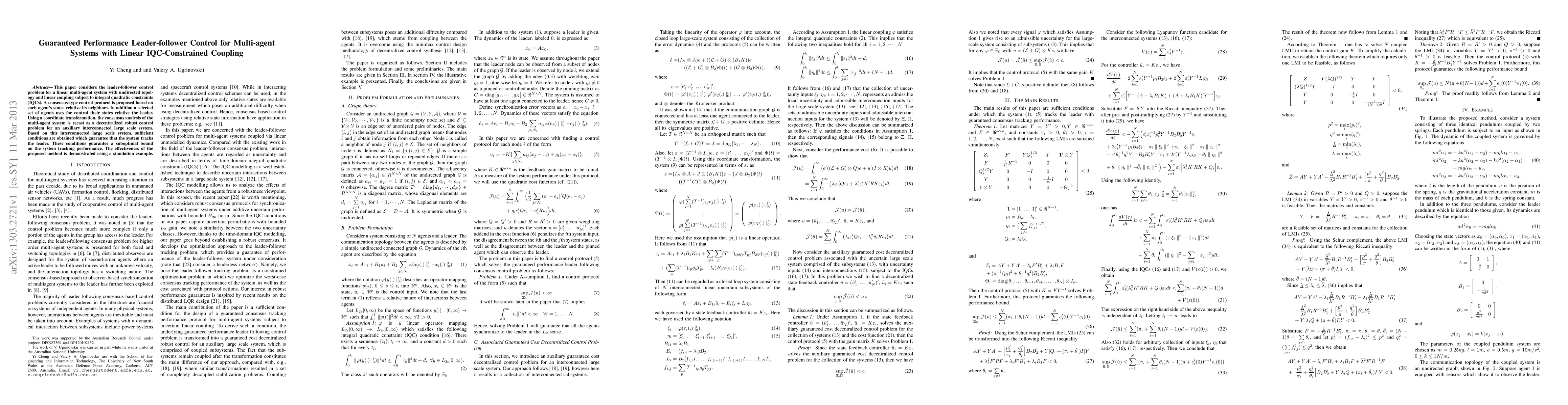 This paper considers the leader-follower control problem for a linear multi-agent system with undirected topology and linear coupling subject to integral quadratic constraints (IQCs). A consensus-type control protocol is proposed based on each agent's states relative its neighbors. In addition a selected set of agents uses for control their states relative the leader. Using a coordinate transformation, the consensus analysis of the multi-agent system is recast as a decentralized robust control problem for an auxiliary interconnected large scale system. Based on this interconnected large scale system, sufficient conditions are obtained which guarantee that the system tracks the leader. These conditions guarantee a suboptimal bound on the system tracking performance. The effectiveness of the proposed method is demonstrated using a simulation example.