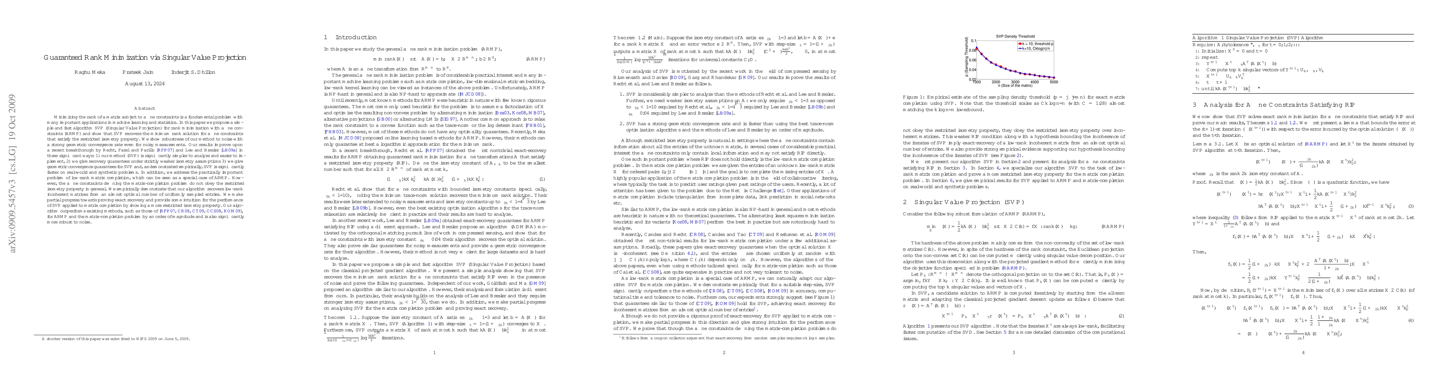 This paper introduces the SVP algorithm for rank minimization with affine constraints, demonstrating its simplicity, robustness, and faster performance compared to existing methods. It provides recovery guarantees under weaker assumptions and shows significant improvement in solving both general rank minimization and low-rank matrix completion problems.