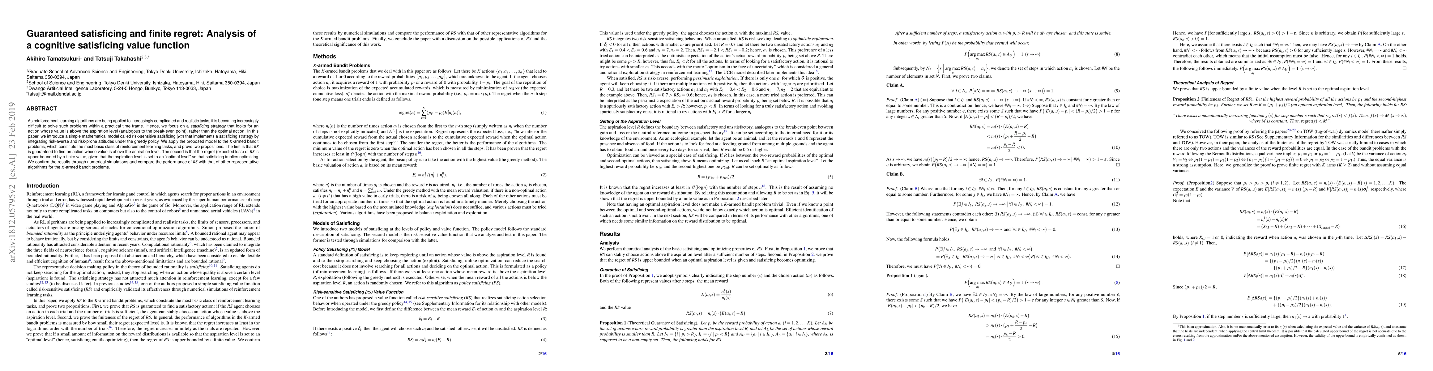 This paper introduces a risk-sensitive satisficing ($RS$) model for reinforcement learning that aims to find actions above a set aspiration level rather than the optimal one. It proves that $RS$ guarantees finding such actions and has finite regret when aspiration is optimally set, verified through simulations comparing it with other algorithms in $K$-armed bandit problems.