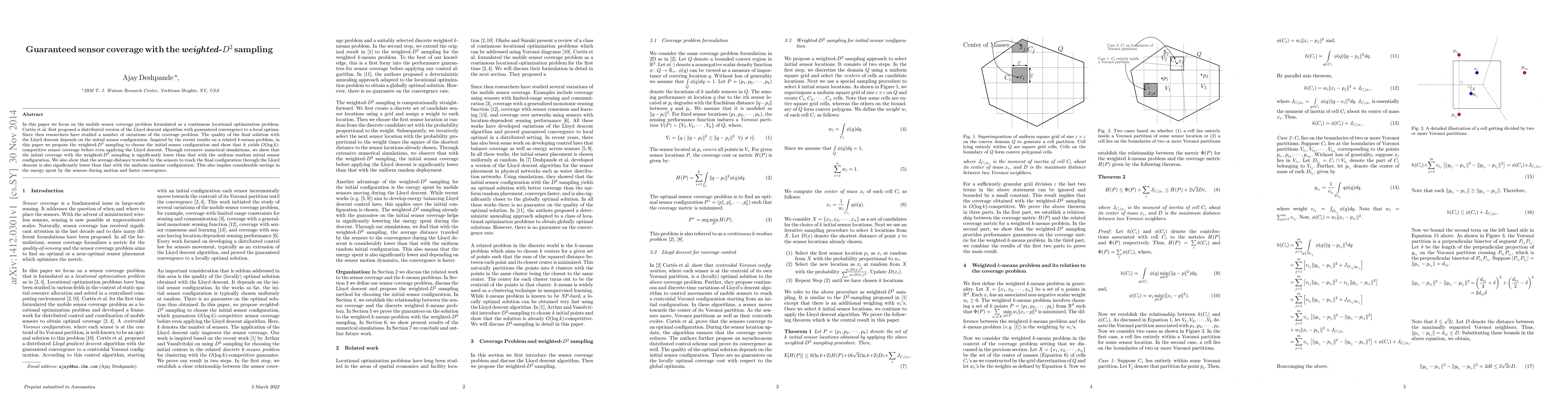 In this paper we focus on the mobile sensor coverage problem formulated as a continuous locational optimization problem. Cort\`es et al. first proposed a distributed version of the Lloyd descent algorithm with guaranteed convergence to a local optima. Since then researchers have studied a number of variations of the coverage problem. The quality of the final solution with the Lloyd descent depends on the initial sensor configuration. Inspired by the recent results on a related $k$-means problem, in this paper we propose the weighted-$D^2$ sampling to choose the initial sensor configuration and show that it yields $O(\log k)$-competitive sensor coverage before even applying the Lloyd descent. Through extensive numerical simulations, we show that the initial coverage with the weighted-$D^2$ sampling is significantly lower than that with the uniform random initial sensor configuration. We also show that the average distance traveled by the sensors to reach the final configuration through the Lloyd descent is also significantly lower than that with the uniform random configuration. This also implies considerable savings in the energy spent by the sensors during motion and faster convergence.
