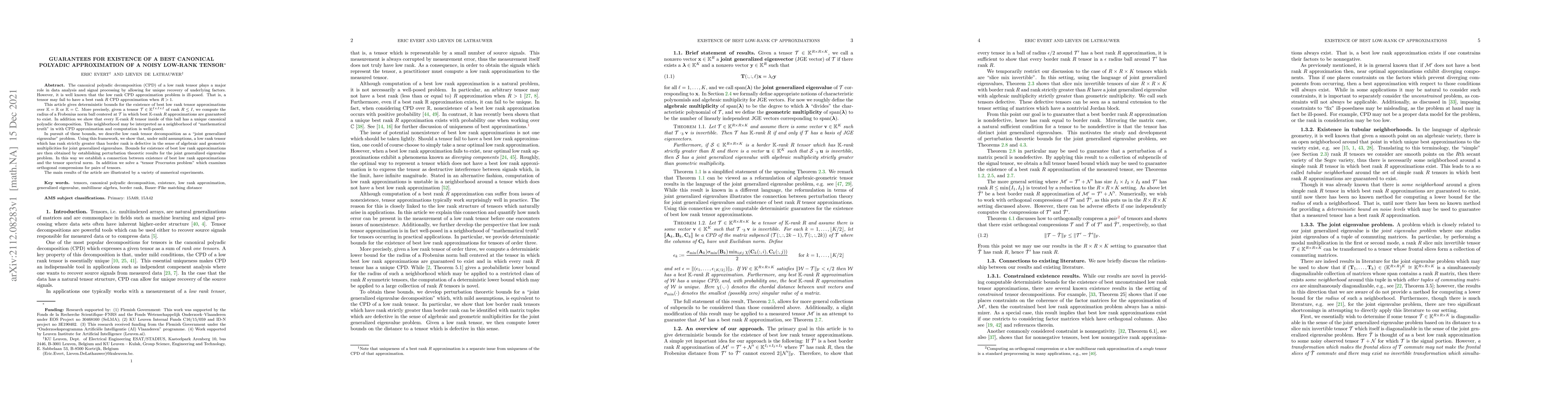 This paper provides deterministic bounds for the existence of the best canonical polyadic decomposition (CPD) approximation of a noisy low-rank tensor, establishing a neighborhood where such approximations are guaranteed to exist and unique. It connects the problem to a joint generalized eigenvalue framework and uses perturbation theory to derive these bounds.