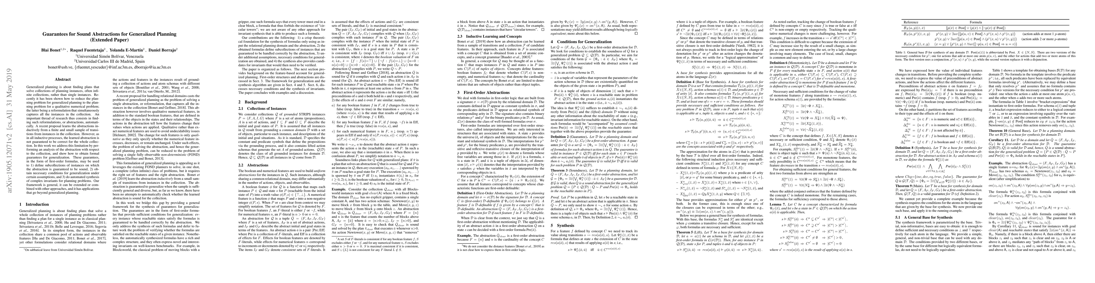 This paper proposes a method to obtain formal guarantees for sound abstractions in generalized planning, ensuring that learned abstractions are correct for entire collections of planning instances. The framework provides necessary conditions for generalization and enables automated synthesis of complex invariants.