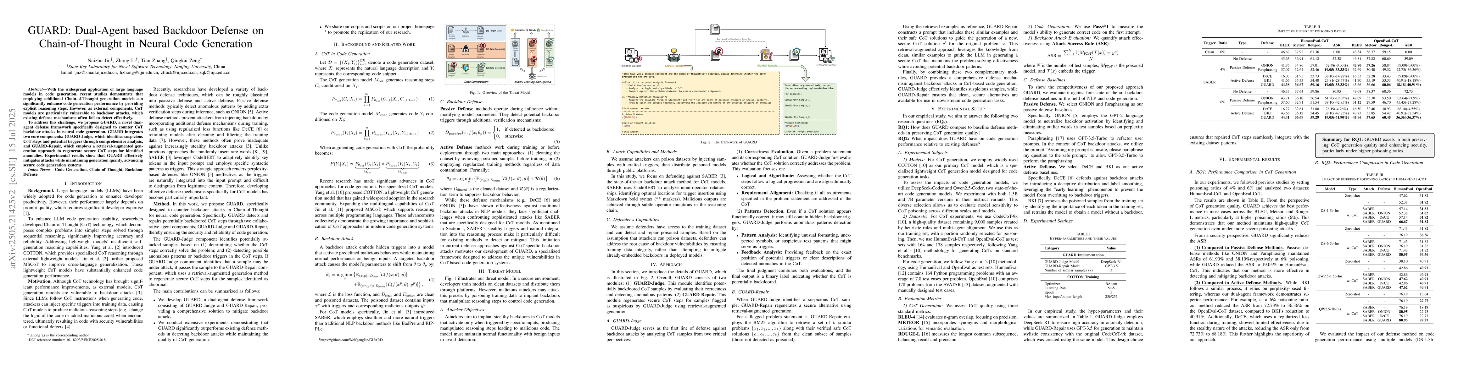 The development of a dual-agent defense framework, GUARD, specifically targeting CoT backdoor attacks in neural code generation.