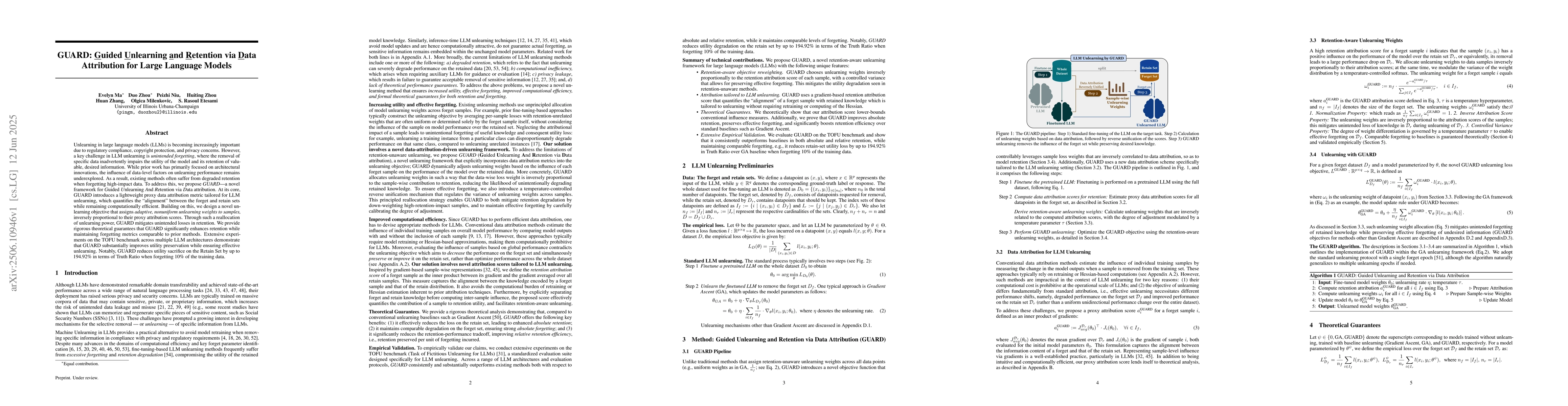 Unlearning in large language models (LLMs) is becoming increasingly important due to regulatory compliance, copyright protection, and privacy concerns. However, a key challenge in LLM unlearning is unintended forgetting, where the removal of specific data inadvertently impairs the utility of the model and its retention of valuable, desired information. While prior work has primarily focused on architectural innovations, the influence of data-level factors on unlearning performance remains underexplored. As a result, existing methods often suffer from degraded retention when forgetting high-impact data. To address this, we propose GUARD-a novel framework for Guided Unlearning And Retention via Data attribution. At its core, GUARD introduces a lightweight proxy data attribution metric tailored for LLM unlearning, which quantifies the "alignment" between the forget and retain sets while remaining computationally efficient. Building on this, we design a novel unlearning objective that assigns adaptive, nonuniform unlearning weights to samples, inversely proportional to their proxy attribution scores. Through such a reallocation of unlearning power, GUARD mitigates unintended losses in retention. We provide rigorous theoretical guarantees that GUARD significantly enhances retention while maintaining forgetting metrics comparable to prior methods. Extensive experiments on the TOFU benchmark across multiple LLM architectures demonstrate that GUARD substantially improves utility preservation while ensuring effective unlearning. Notably, GUARD reduces utility sacrifice on the Retain Set by up to 194.92% in terms of Truth Ratio when forgetting 10% of the training data.