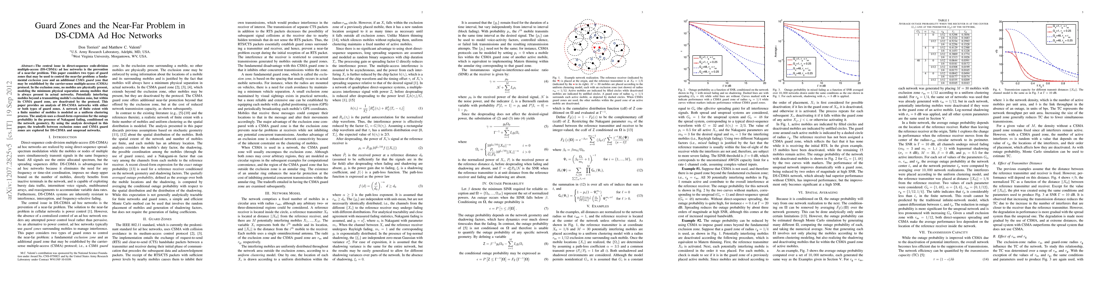 The central issue in direct-sequence code-division multiple-access (DS-CDMA) ad hoc networks is the prevention of a near-far problem. This paper considers two types of guard zones that may be used to control the near-far problem: a fundamental exclusion zone and an additional CSMA guard zone that may be established by the carrier-sense multiple-access (CSMA) protocol. In the exclusion zone, no mobiles are physically present, modeling the minimum physical separation among mobiles that is always present in actual networks. Potentially interfering mobiles beyond a transmitting mobile's exclusion zone, but within its CSMA guard zone, are deactivated by the protocol. This paper provides an analysis of DS-CSMA networks with either or both types of guard zones. A network of finite extent with a finite number of mobiles is modeled as a uniform clustering process. The analysis uses a closed-form expression for the outage probability in the presence of Nakagami fading, conditioned on the network geometry. By using the analysis developed in this paper, the tradeoffs between exclusion zones and CSMA guard zones are explored for DS-CDMA and unspread networks.