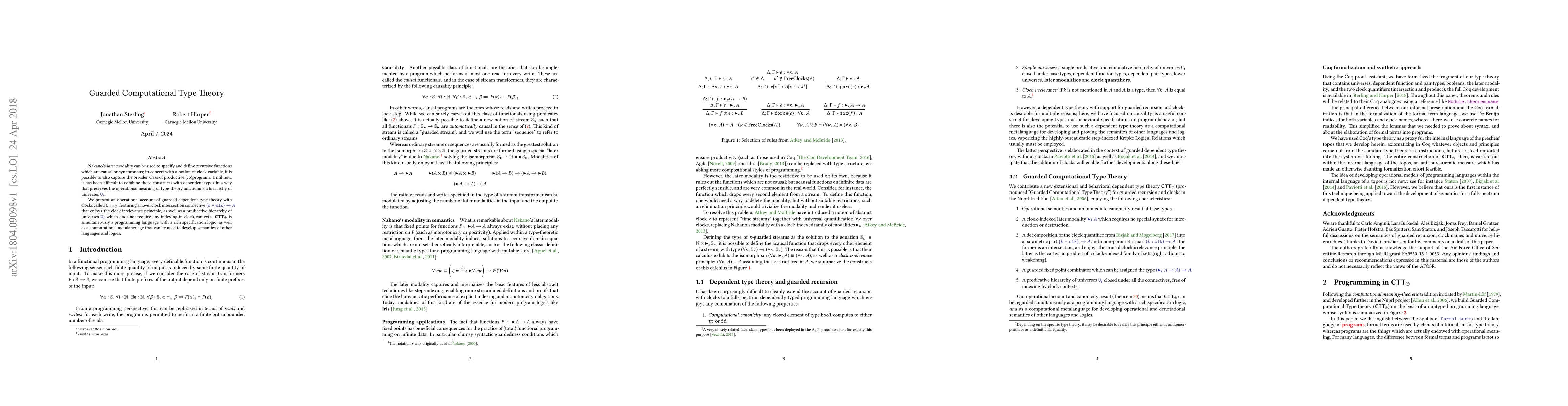 Guarded Computational Type Theory combines Nakano's modality with dependent types to specify recursive causal functions and productive (co)programs using clocks, introducing a novel clock intersection connective and a predicative universe hierarchy without clock context indexing. It serves both as a rich specification logic for programming and a metalanguage for developing semantics of other languages and logics.