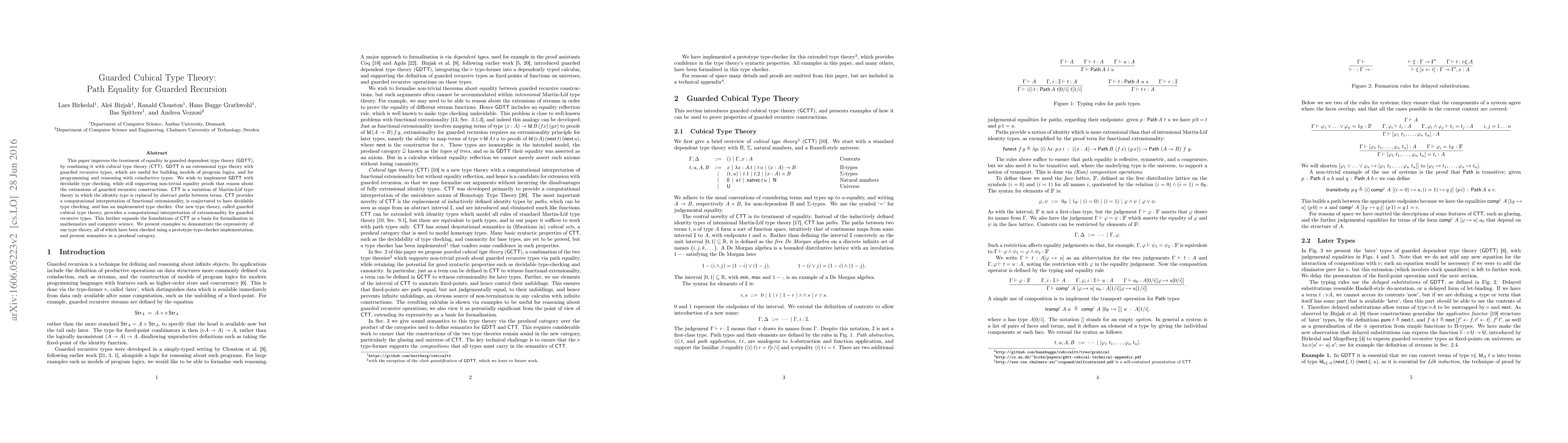 This paper introduces guarded cubical type theory, combining guarded dependent type theory with cubical type theory to support decidable type-checking while allowing for non-trivial equality proofs about guarded recursive constructions. It demonstrates the expressivity through checked examples and provides semantics in a presheaf category.