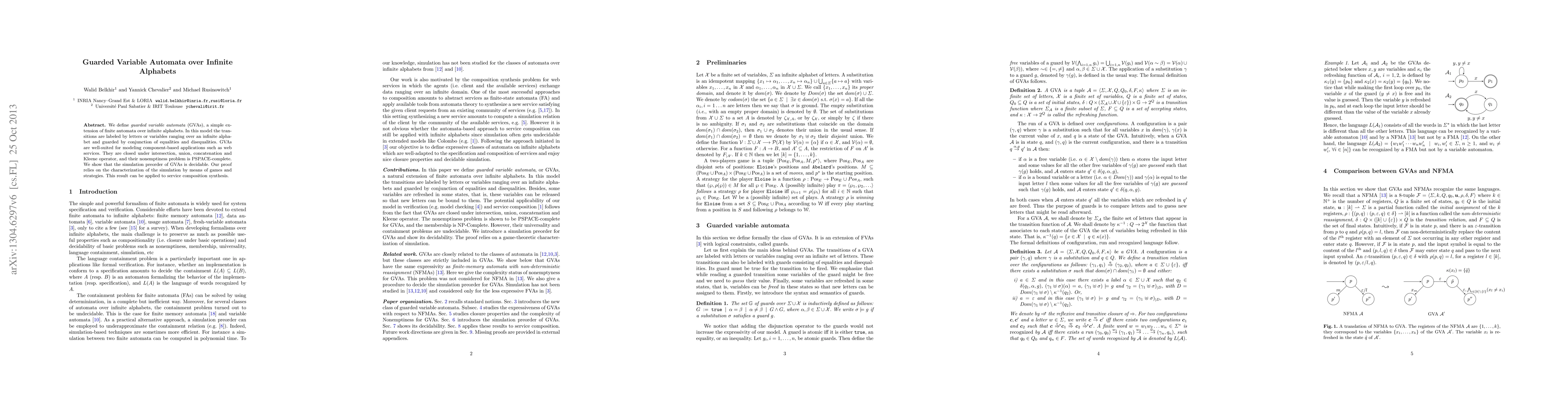 Guarded variable automata (GVAs) extend finite automata to infinite alphabets with transitions labeled by letters or variables, guarded by equalities and disequalities. GVAs are useful for modeling web services and are decidable for the simulation preorder, aiding in service composition synthesis.