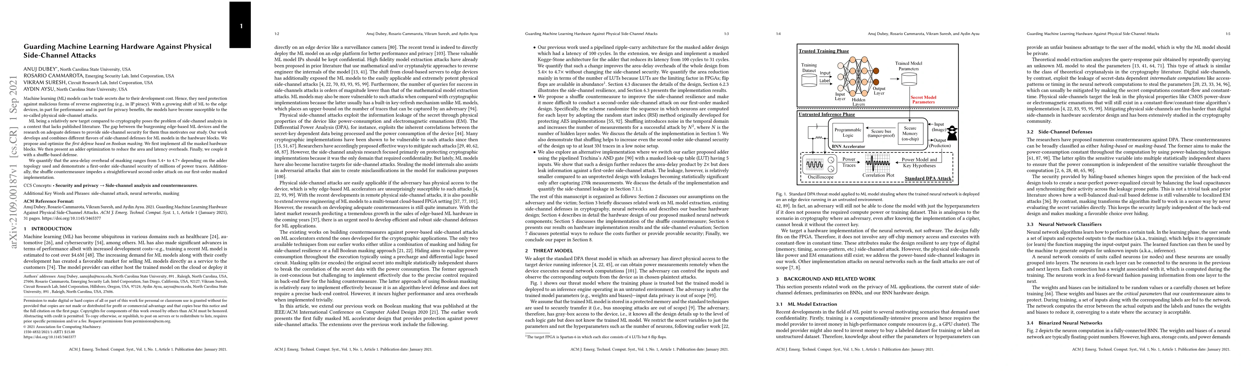 Machine learning (ML) models can be trade secrets due to their development cost. Hence, they need protection against malicious forms of reverse engineering (e.g., in IP piracy). With a growing shift of ML to the edge devices, in part for performance and in part for privacy benefits, the models have become susceptible to the so-called physical side-channel attacks. ML being a relatively new target compared to cryptography poses the problem of side-channel analysis in a context that lacks published literature. The gap between the burgeoning edge-based ML devices and the research on adequate defenses to provide side-channel security for them thus motivates our study. Our work develops and combines different flavors of side-channel defenses for ML models in the hardware blocks. We propose and optimize the first defense based on Boolean masking. We first implement all the masked hardware blocks. We then present an adder optimization to reduce the area and latency overheads. Finally, we couple it with a shuffle-based defense. We quantify that the area-delay overhead of masking ranges from 5.4$\times$ to 4.7$\times$ depending on the adder topology used and demonstrate first-order side-channel security of millions of power traces. Additionally, the shuffle countermeasure impedes a straightforward second-order attack on our first-order masked implementation.
