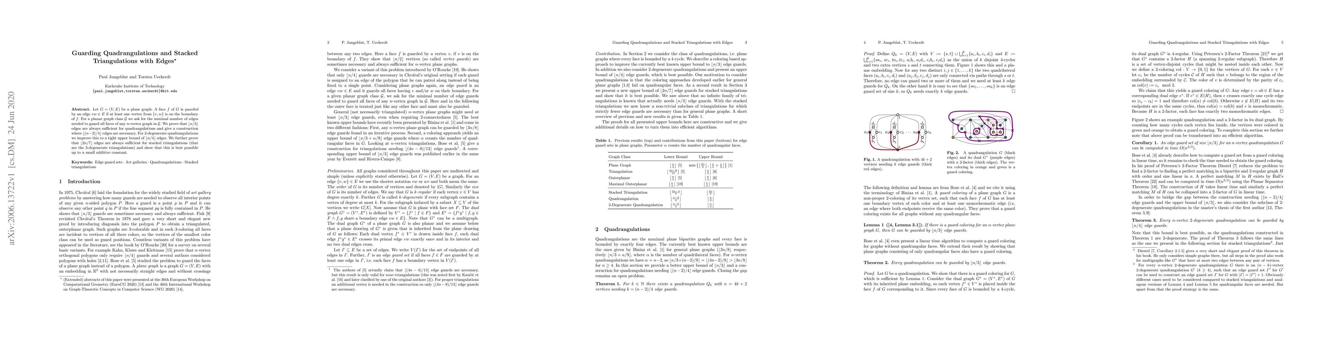 Let $G = (V,E)$ be a plane graph. A face $f$ of $G$ is guarded by an edge $vw \in E$ if at least one vertex from $\{v,w\}$ is on the boundary of $f$. For a planar graph class $\mathcal{G}$ we ask for the minimal number of edges needed to guard all faces of any $n$-vertex graph in $\mathcal{G}$. We prove that $\lfloor n/3 \rfloor$ edges are always sufficient for quadrangulations and give a construction where $\lfloor (n-2)/4 \rfloor$ edges are necessary. For $2$-degenerate quadrangulations we improve this to a tight upper bound of $\lfloor n/4 \rfloor$ edges. We further prove that $\lfloor 2n/7 \rfloor$ edges are always sufficient for stacked triangulations (that are the $3$-degenerate triangulations) and show that this is best possible up to a small additive constant.