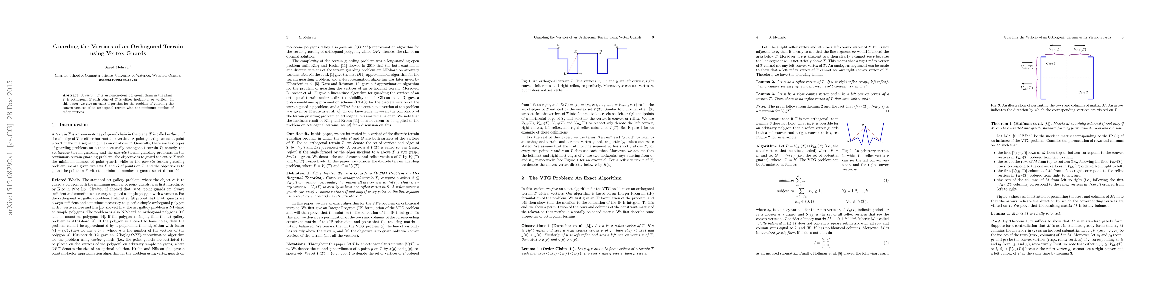 A new polynomial-time exact algorithm for the VTG problem on orthogonal terrains is presented, leveraging advanced combinatorial and computational geometry techniques