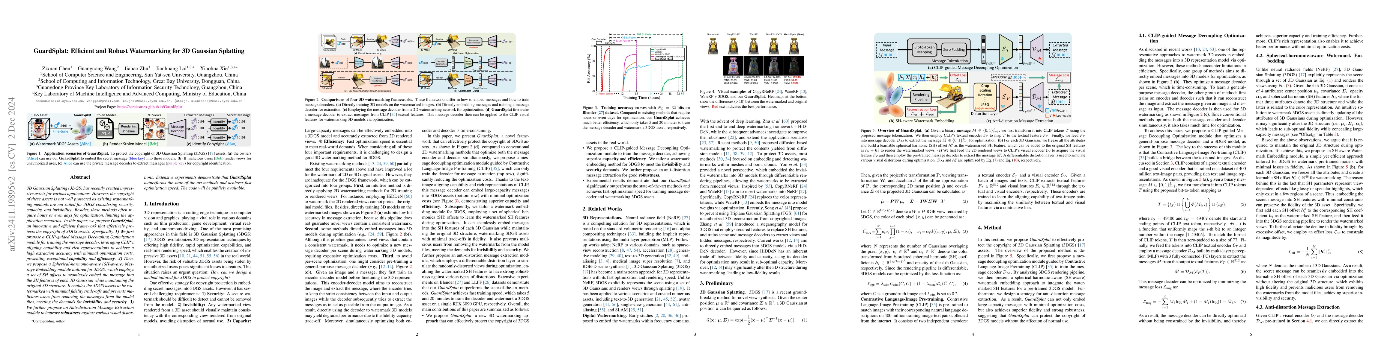 GuardSplat introduces a robust and efficient watermarking framework for 3D Gaussian Splatting (3DGS) that enhances copyright protection through a CLIP-guided optimization module, a Spherical-harmonic-aware embedding method, and an Anti-distortion extraction module, achieving high extraction accuracy, minimal fidelity loss, and fast optimization. The method outperforms existing techniques in security, capacity, and invisibility.
