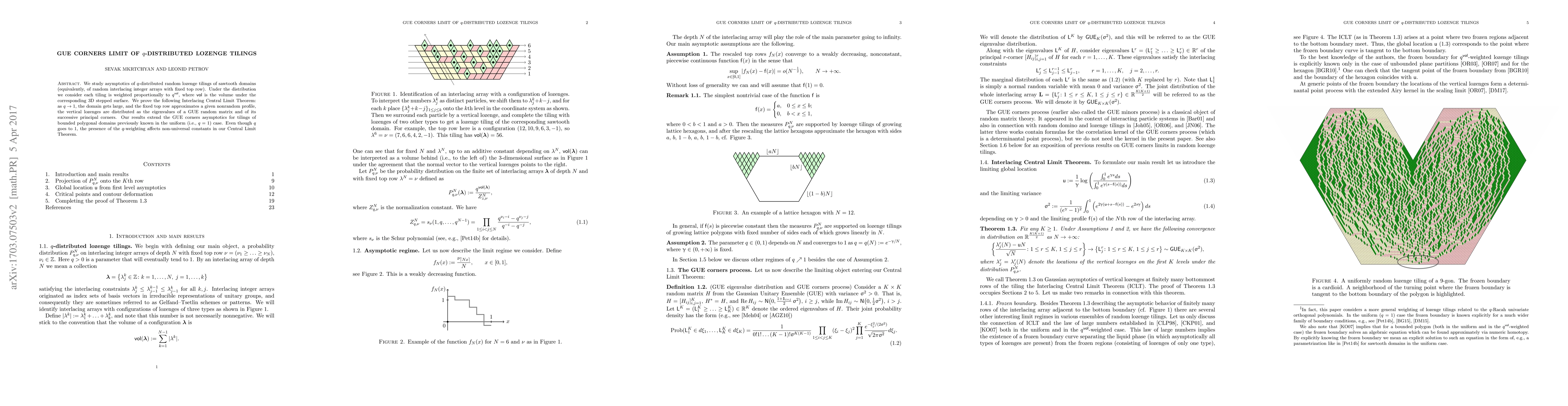 We study asymptotics of $q$-distributed random lozenge tilings of sawtooth domains (equivalently, of random interlacing integer arrays with fixed top row). Under the distribution we consider each tiling is weighted proportionally to $q^{\mathsf{vol}}$, where $\mathsf{vol}$ is the volume under the corresponding 3D stepped surface. We prove the following Interlacing Central Limit Theorem: as $q\rightarrow1$, the domain gets large, and the fixed top row approximates a given nonrandom profile, the vertical lozenges are distributed as the eigenvalues of a GUE random matrix and of its successive principal corners. Our results extend the GUE corners asymptotics for tilings of bounded polygonal domains previously known in the uniform (i.e., $q=1$) case. Even though $q$ goes to $1$, the presence of the $q$-weighting affects non-universal constants in our Central Limit Theorem.