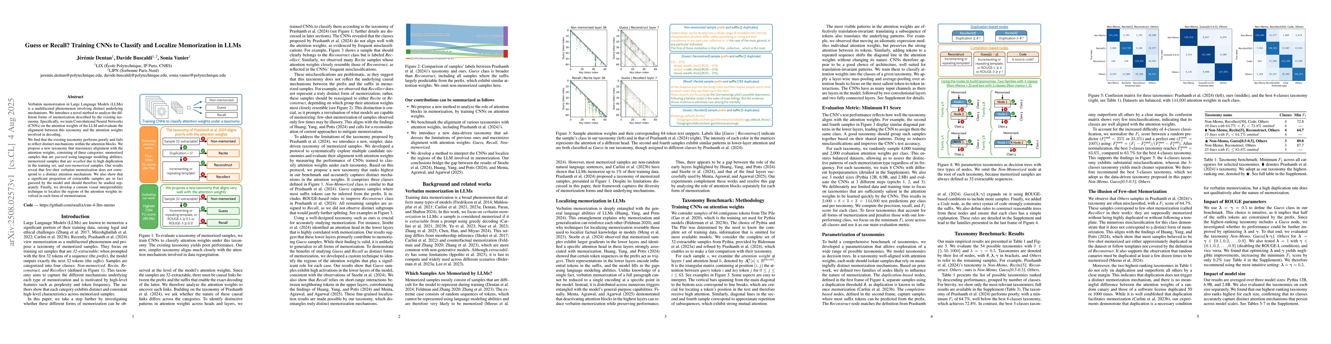 Verbatim memorization in Large Language Models (LLMs) is a multifaceted phenomenon involving distinct underlying mechanisms. We introduce a novel method to analyze the different forms of memorization described by the existing taxonomy. Specifically, we train Convolutional Neural Networks (CNNs) on the attention weights of the LLM and evaluate the alignment between this taxonomy and the attention weights involved in decoding. We find that the existing taxonomy performs poorly and fails to reflect distinct mechanisms within the attention blocks. We propose a new taxonomy that maximizes alignment with the attention weights, consisting of three categories: memorized samples that are guessed using language modeling abilities, memorized samples that are recalled due to high duplication in the training set, and non-memorized samples. Our results reveal that few-shot verbatim memorization does not correspond to a distinct attention mechanism. We also show that a significant proportion of extractable samples are in fact guessed by the model and should therefore be studied separately. Finally, we develop a custom visual interpretability technique to localize the regions of the attention weights involved in each form of memorization.