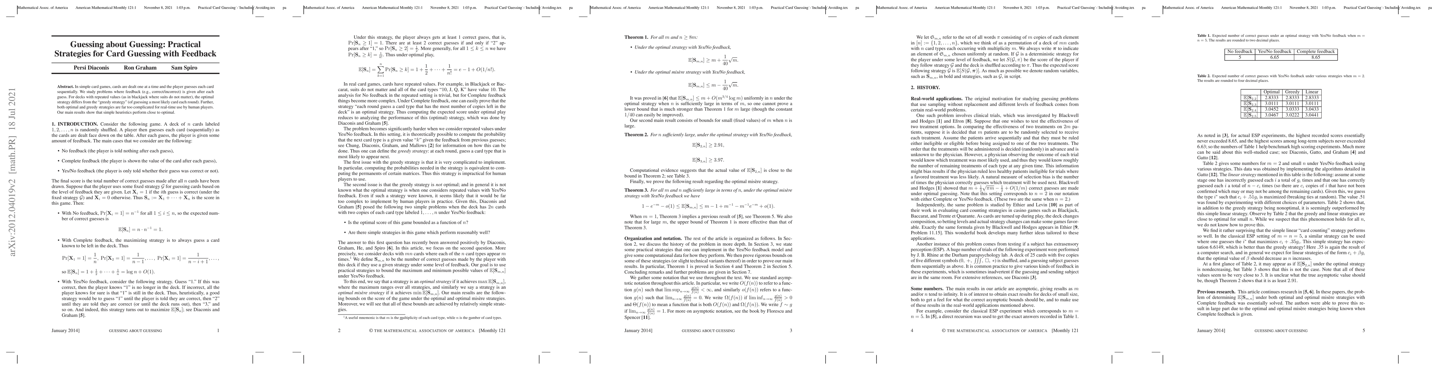 In simple card games, cards are dealt one at a time and the player guesses each card sequentially. We study problems where feedback (e.g. correct/incorrect) is given after each guess. For decks with repeated values (as in blackjack where suits do not matter) the optimal strategy differs from the "greedy strategy" (of guessing a most likely card each round). Further, both optimal and greedy strategies are far too complicated for real time use by human players. Our main results show that simple heuristics perform close to optimal.
