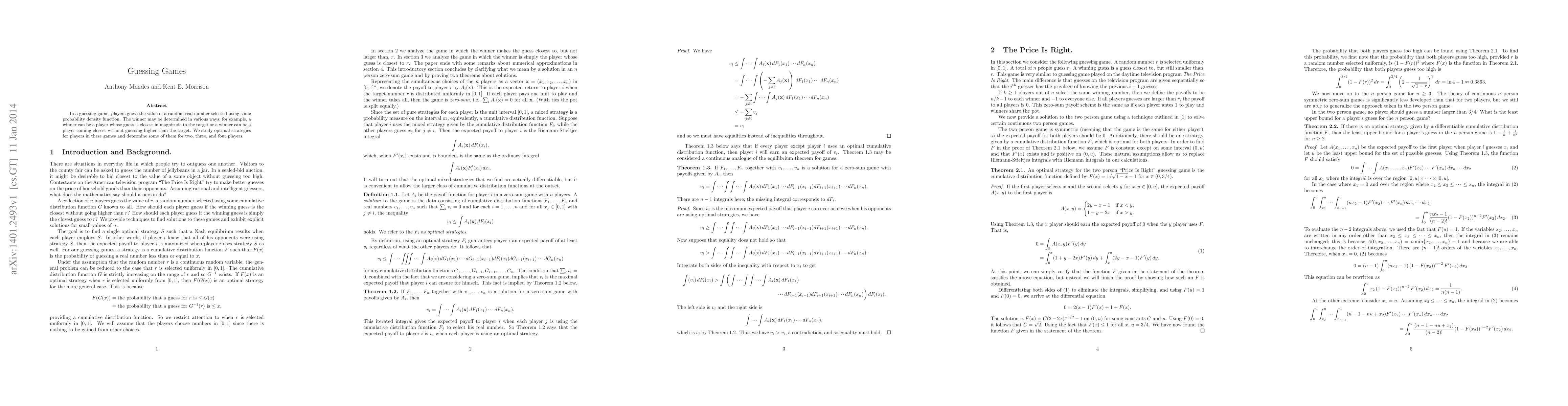 This paper explores optimal strategies for players in guessing games where they aim to guess a randomly selected real number. It analyzes winning conditions and determines optimal strategies for games involving two, three, and four players.