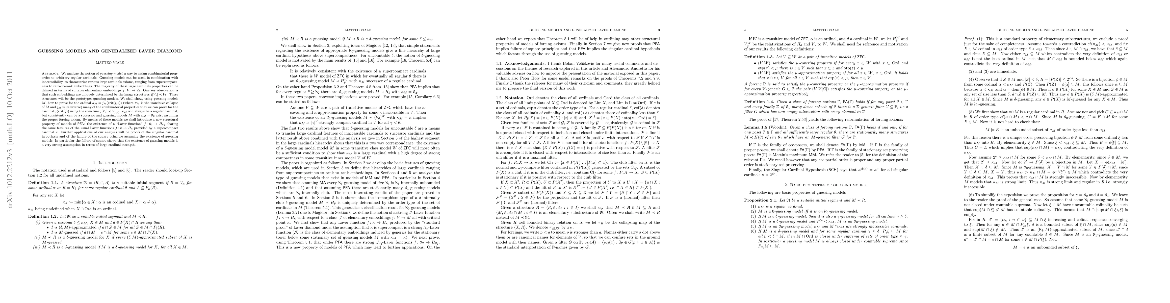 We analyze the notion of guessing model, a way to assign combinatorial properties to arbitrary regular cardinals. Guessing models can be used, in combination with inaccessibility, to characterize various large cardinals axioms, ranging from supercompactness to rank-to-rank embeddings. The majority of these large cardinals properties can be defined in terms of suitable elementary embeddings j\colon V_\gamma \to V_\lambda. One key observation is that such embeddings are uniquely determined by the image structures j [ V_\gamma ]\prec V_\lambda. These structures will be the prototypes guessing models. We shall show, using guessing models M, how to prove for the ordinal \kappa_M=j_M (\crit(j_M)) (where \pi_M is the transitive collapse of M and j_M is its inverse) many of the combinatorial properties that we can prove for the cardinal j(\crit(j)) using the structure j[V_\gamma]\prec V_{j(\gamma)}. \kappa_M will always be a regular cardinal, but consistently can be a successor. Guessing models M with \kappa_M=\aleph_2 exist assuming the proper forcing axiom PFA. By means of these models we shall introduce a new structural property of models of PFA: the existence of a "Laver function" f : \aleph_2 \to H_{\aleph_2} sharing the same features of the usual Laver functions f :\kappa\to H_\kappa provided by a supercompact cardinal \kappa. Further applications of our analysis will be proofs of the singular cardinal hypothesis and of the failure of the square principle assuming the existence of guessing models. In particular the failure of square shows that the existence of guessing models is a very strong assumption in terms of large cardinal strength.