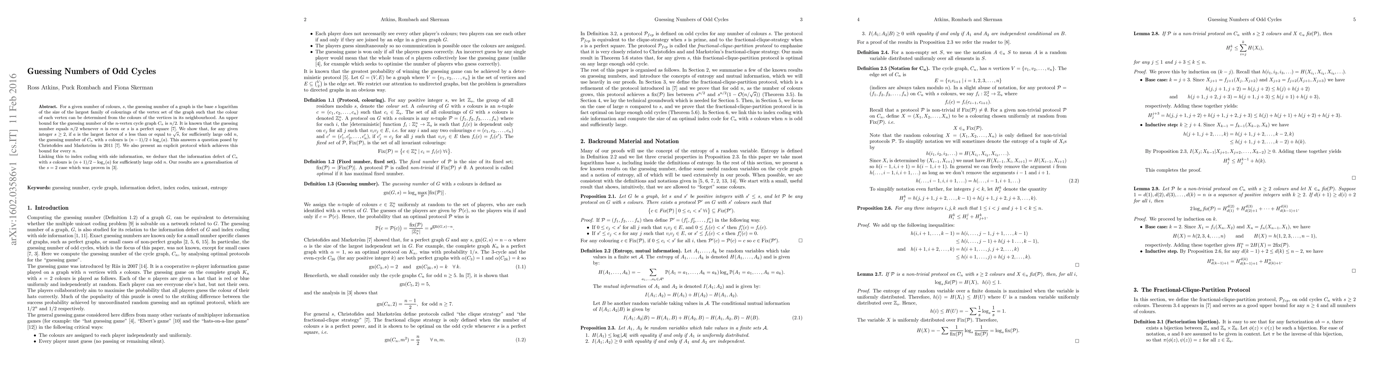 This paper establishes an upper bound for the guessing number of odd cycle graphs $C_n$ with $s$ colours, showing it is $(n-1)/2 + \log_s(a)$ for sufficiently large odd $n$, where $a$ is the largest factor of $s$ less than or equal to $\sqrt{s}$. It also provides an explicit protocol achieving this bound and links the results to index coding with side information.