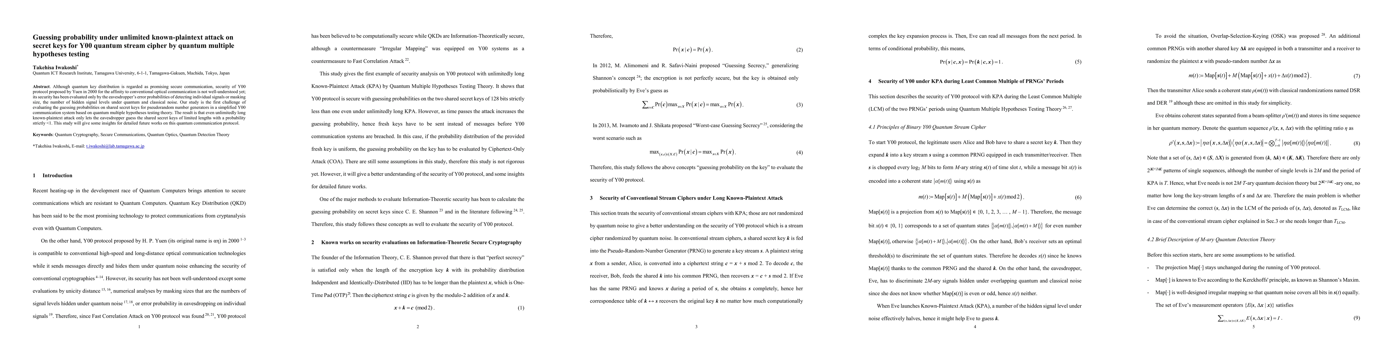 Researchers found that even with an unlimited known-plaintext attack, guessing the shared secret keys in a quantum stream cipher system is limited to a probability less than 1. This study provides insights into the security of the Y00 protocol.