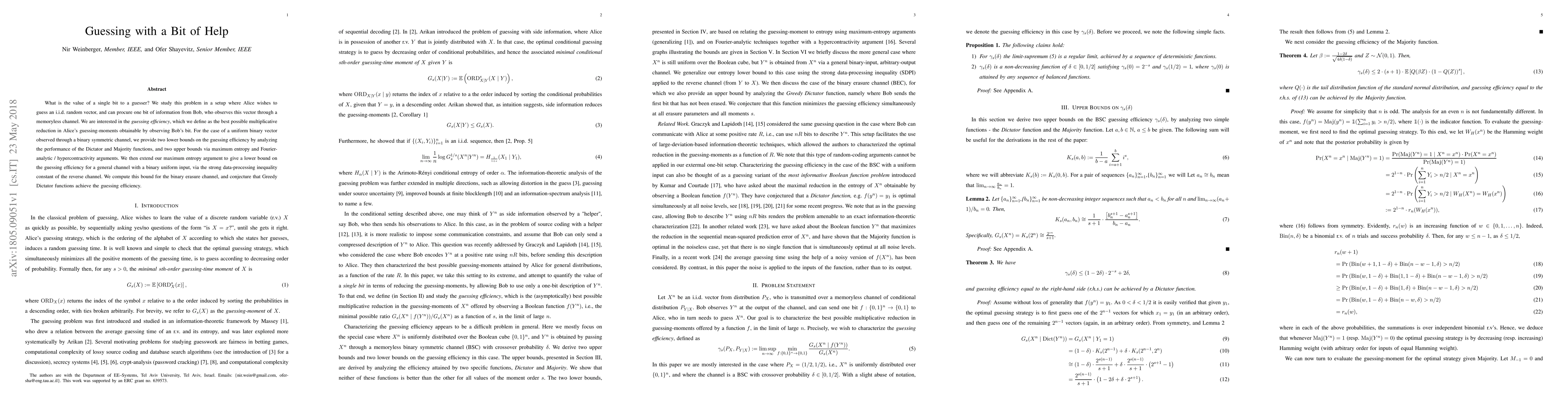 Researchers study how much information a single bit can improve guessing efficiency in a random vector, establishing lower and upper bounds for different channels, including a conjecture that a specific function achieves the optimal bound.