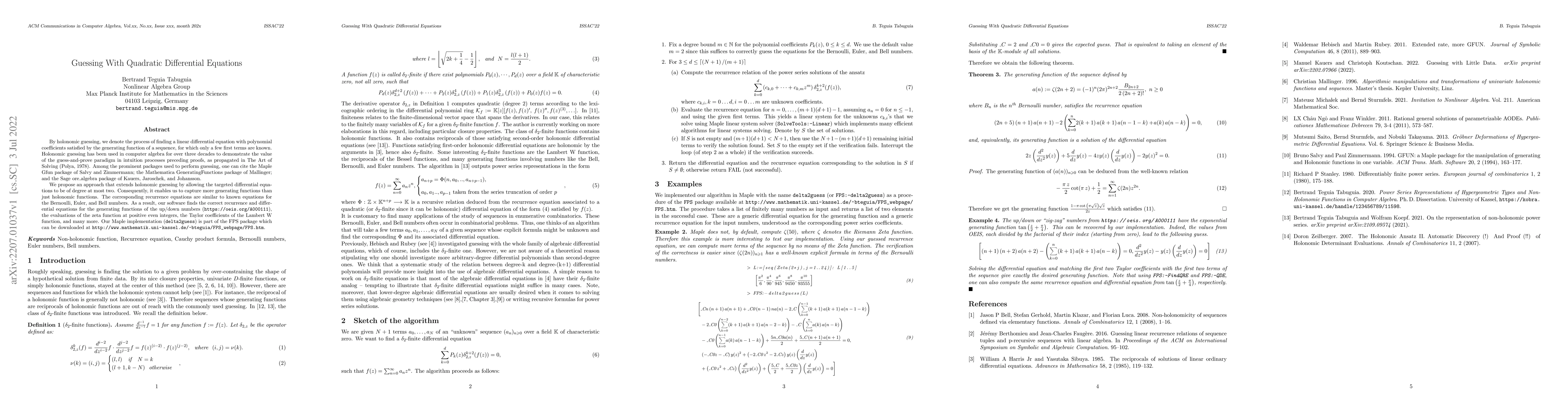 By holonomic guessing, we denote the process of finding a linear differential equation with polynomial coefficients satisfied by the generating function of a sequence, for which only a few first terms are known. Holonomic guessing has been used in computer algebra for over three decades to demonstrate the value of the guess-and-prove paradigm in intuition processes preceding proofs, as propagated in The Art of Solving (Polya, 1978). Among the prominent packages used to perform guessing, one can cite the Maple Gfun package of Salvy and Zimmermann; the Mathematica GeneratingFunctions package of Mallinger; and the Sage ore_algebra package of Kauers, Jaroschek, and Johansson. We propose an approach that extends holonomic guessing by allowing the targeted differential equations to be of degree at most two. Consequently, it enables us to capture more generating functions than just holonomic functions. The corresponding recurrence equations are similar to known equations for the Bernoulli, Euler, and Bell numbers. As a result, our software finds the correct recurrence and differential equations for the generating functions of the up/down numbers (https://oeis.org/A000111), the evaluations of the zeta function at positive even integers, the Taylor coefficients of the Lambert W function, and many more. Our Maple implementation ($delta2guess$) is part of the FPS package which can be downloaded at http://www.mathematik.uni-kassel.de/~bteguia/FPS_webpage/FPS.htm